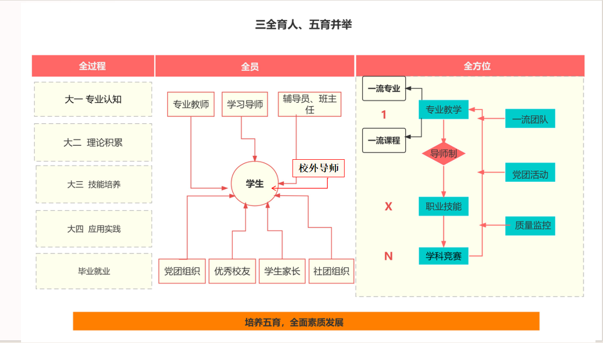 因材施教、落实立德树人任务 英语、商务英语和法学专业四年全程实行校内+校外导师制,学生和导师之间进行双向选择,以生为本、因材施教、精细化培养。