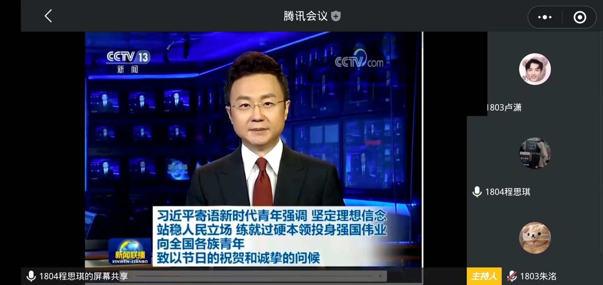 为进一步深入学习贯彻习近平总书记五四寄语精神,响应院团委“学习习近平总书记五四寄语精神”主题活动的号召,2020年5月20日16:30,公共学部采用腾讯会议的方式举办“我的青春誓言分享研讨会”,出席本次会议的有公共学部团总支书记张婷婷老师、团学组织全体成员以及17-19各班团支书、宣传委员、组织委员。本次会议由程思琪同学主持。