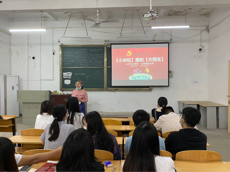 (通讯员 齐君)2020年9月16日中午12点,外语学院党总支第三党支部在一教学楼1314教室开展了廉政微党课《小米粒里的大民生》。本次廉政微党课的主讲人是外语学院的党总支副书记齐君同志,她以习近平总书记近日对制止餐饮浪费行为作出的重要指示导入主题,从怀危机意识 保“大国粮仓”、筑长效机制 杜绝“舌尖上的浪费”和兴节约之风 将传统美德宣传好落实细三个方面提倡“厉行节约、反对浪费”的社会风尚。党的十八大以来,各地区各部门大力整治奢靡之风,不少领域的浪费现象明显减少。尽管我国粮食生产连年丰收,对粮食安全还是始终要有危机意识,今年全球新冠肺炎疫情所带来的影响更是给我们敲响了警钟。厉行节约、反对浪费这根弦一刻也不能放松,必须常抓不懈、久久为功。勤俭节约是中华民族的传统美德,也是干事创业、兴国兴邦的重要基石,要使之内化于心、外践于行。要坚决抵制生活奢靡、贪图享乐等不良习气,从珍惜一粒米这样的小事做起,日积月累、成风化人,才能逐渐形成勤俭节约的良好风尚。“木受绳则直,金就砺则利”,完善的法律制度是遏制浪费现象的有力保障。要加强立法,强化监管,采取更有针对性的有效措施,坚决制止浪费行为。齐君同志也向在座的党员提出要求,大家要带头落实相关制度,在厉行节约、反对浪费上作表率,以自身的示范行动带动更多人践行勤俭节约新风尚,推动社会风气进一步好转。