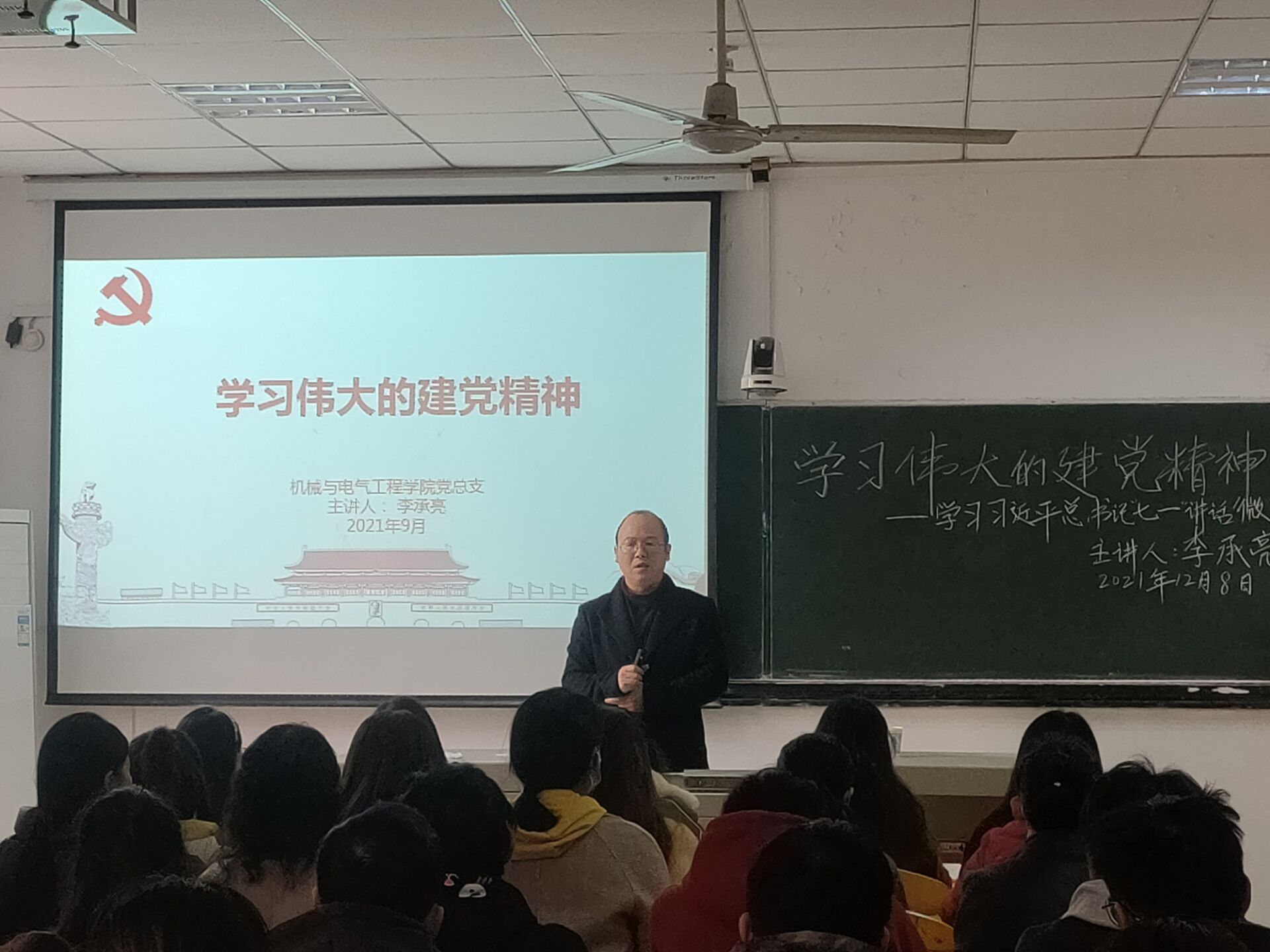 李书记从今年7月1日在北京天安门广场举行的庆祝中国共产党成立100周年大会上习近平总书记首次提出的伟大建党精神谈起,围绕“坚持真理、坚守理想,践行初心、担当使命,不怕牺牲、英勇斗争,对党忠诚、不负人民”的伟大建党精神,结合马克思主义理论和中国共产党的党史,系统地向大家讲授了其深刻内涵。并用丰富而生动的实例,引导在座的学生党员理论联系实际践行伟大建党精神,勇担伟大复兴使命。李书记旁征博引,用通俗易懂的语言、深入浅出的讲授,带领师生党员共同回顾党的光辉历史、领悟伟大建党精神的深刻内涵,让党员同志们初心更加坚定、精神更加振奋。