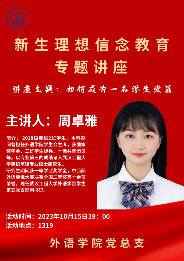2023年10月15日晚19:00,外语学院党总支于1319教室召开23级新生入党启蒙专题培训——如何成为一名学生党员。本次讲座邀请2022届校友周卓雅为外语学院23级新生分享大学四年的生涯规划以及如何成为一名学生党员,本次专题培训由外语学院党总支副书记齐君主持。