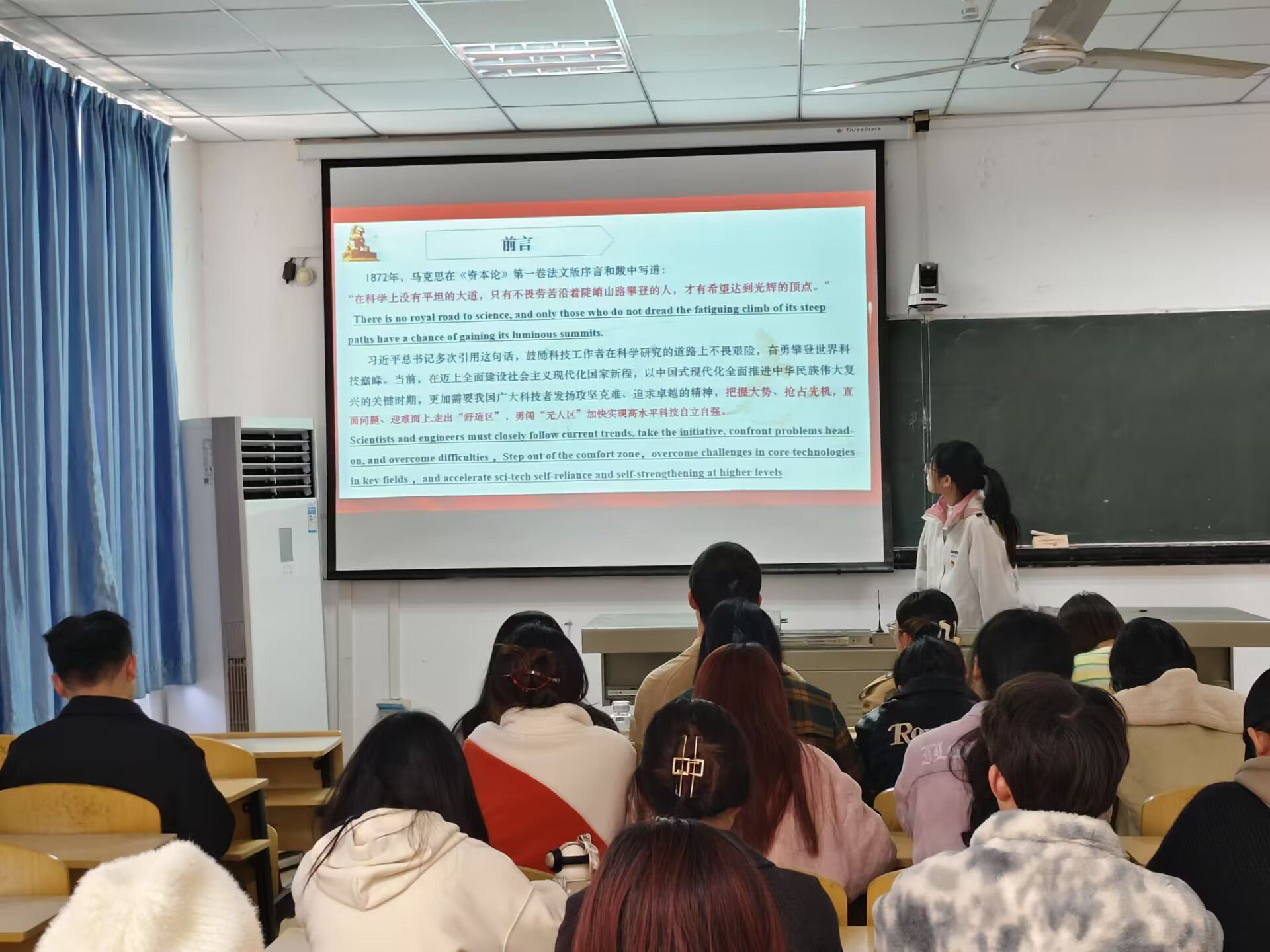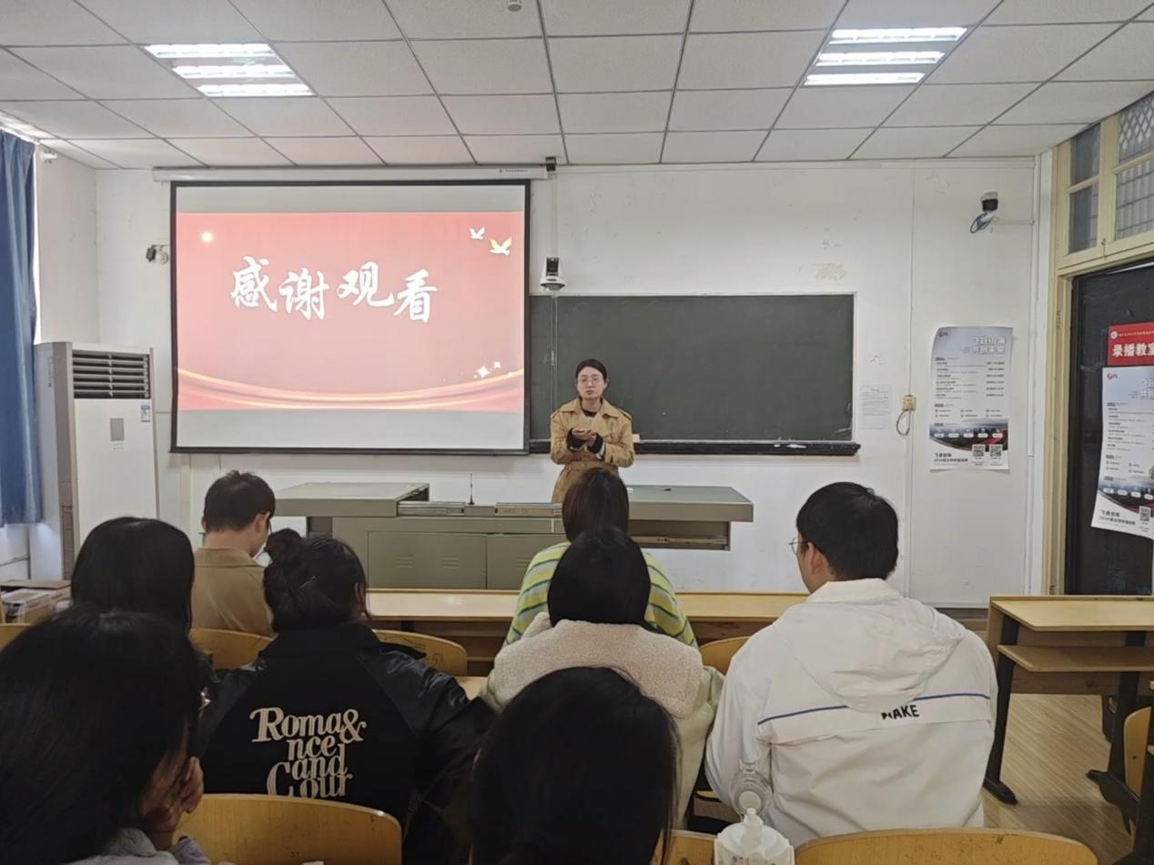 为了深入推进团员和青年主题教育活动,加强理论学习,外语学院注重发挥党建带团建的组织优势,于2023年11月20日在1308教室开展“党建带团建双语微党课”主题教育活动,参加活动的有外语学院党总支副书记、、办公室主任孙榕、外语学院党总支第三党支部全体党员、团总支学生骨干及各年级团员代表参加本次活动,本次微党课由学生党员周林敏主讲。