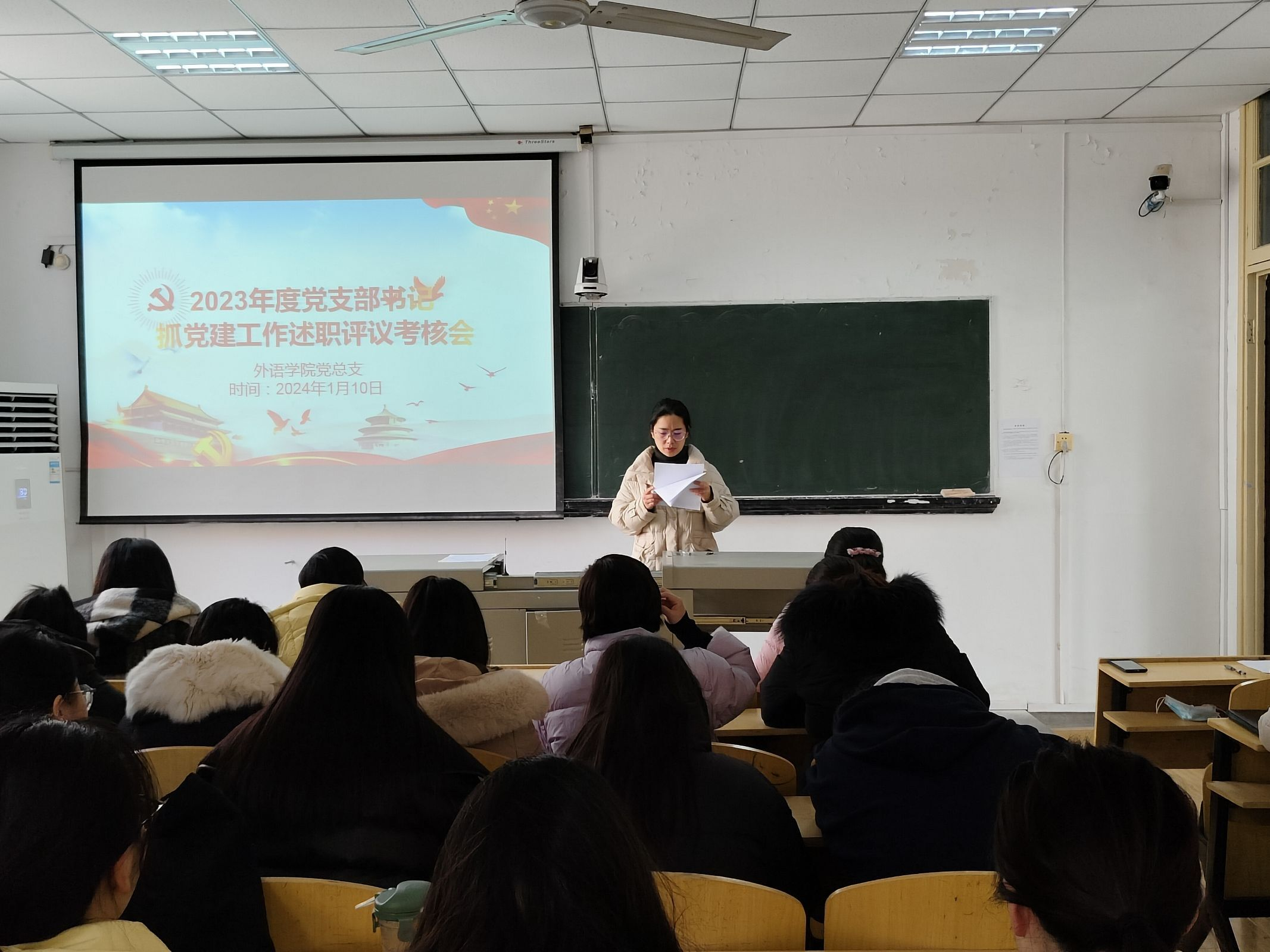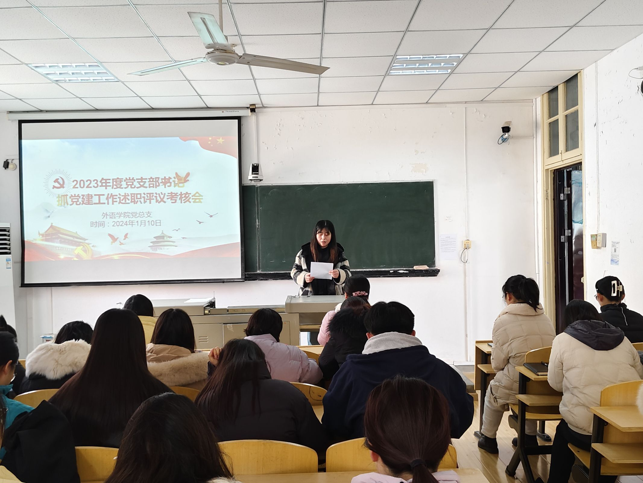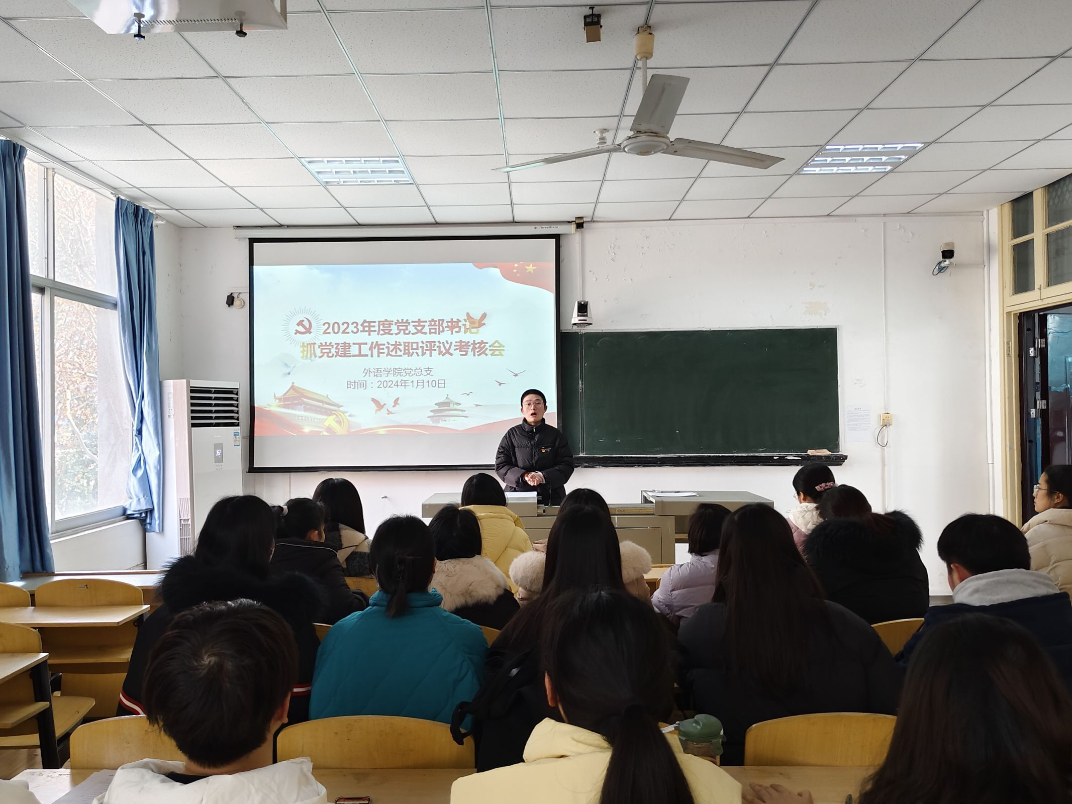 2024年1月10日中午,外语学院党总支在1308教室举行2023年度党支部书记抓党建工作述职评议考核会,本次会议由外语学院党总支副书记齐君主持。外语学院党总支班子成员、辅导员及师生党员代表参加了此次述职评议考核会。