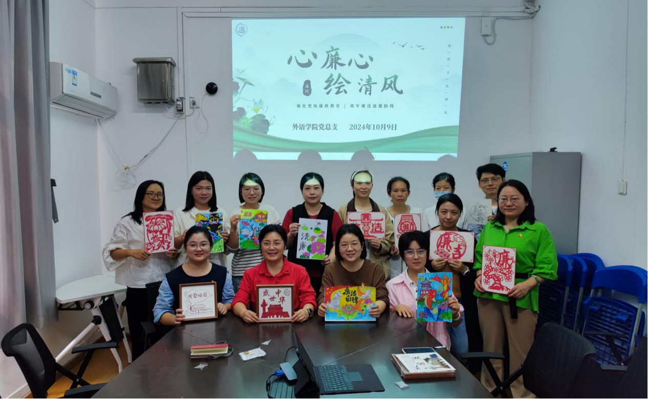 为扎实推进党风廉政建设,全力打造廉洁自律的教师队伍,10月9日中午,外语学院党总支在1323党员活动室开展“心廉心 绘清风”党风廉政教育活动,外语学院全体教职工党员参加。