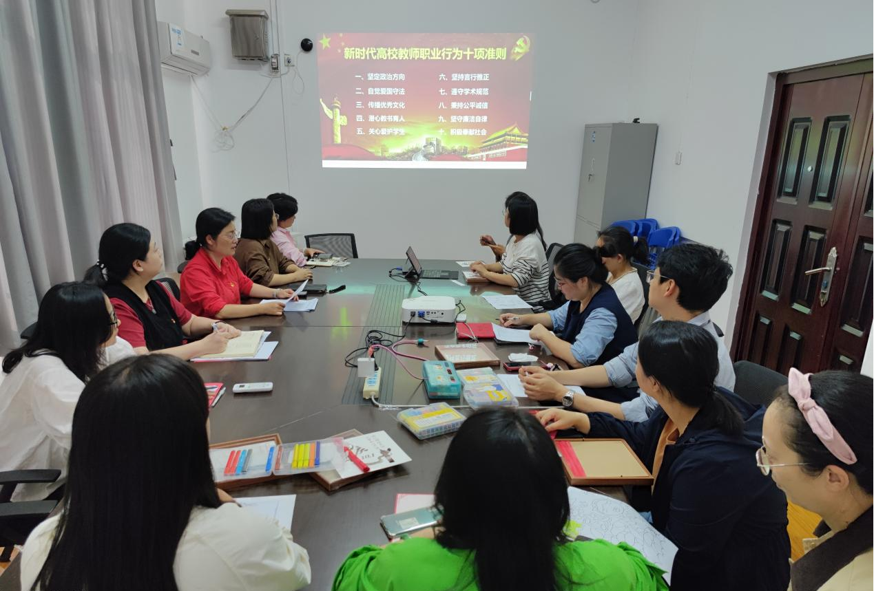 活动中,外语学院党总支书记李春英带领大家认真学习并深入解读了“新时代高校教师职业行为十项准则”,她结合师德师风典型案例做警示教育,强调要坚定职业道德规范,注意课堂授课内容和言行表达,不断提升自身修养。