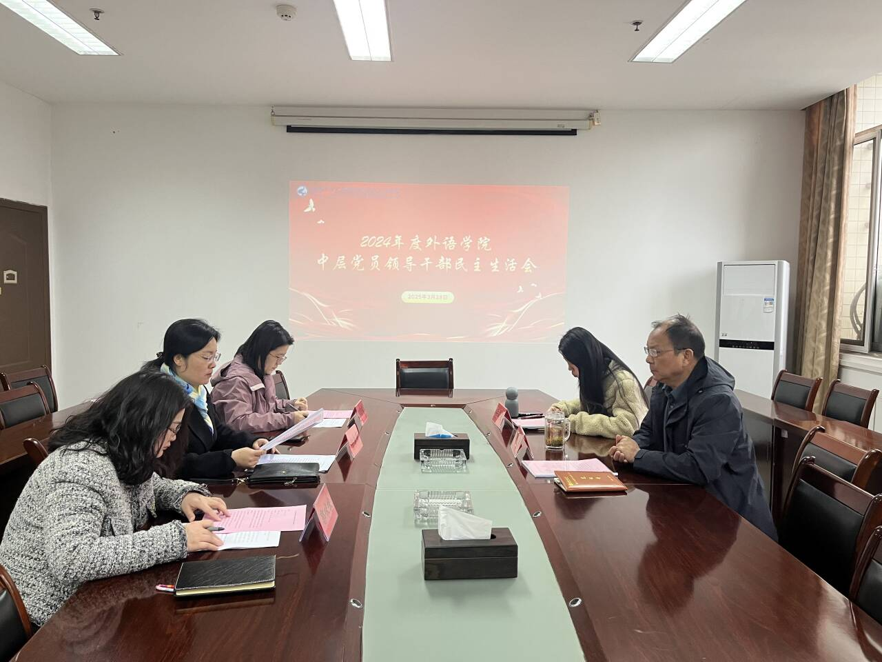 2025年3月28日上午,外语学院在办公楼213会议室召开2024年度中层党员领导干部民主生活会。学院院长冯兵、党政办公室对外交流合作中心文秘室主任李灵瑾到会指导。外语学院党总支书记、院长李春英主持会议并讲话,外语学院领导班子成员参加会议。