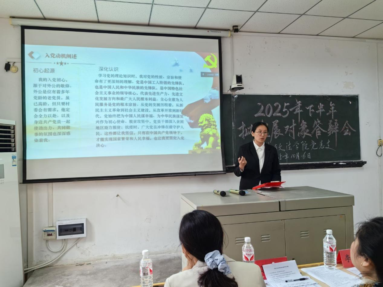 为进一步加强学院学生党建工作,严格党员发展程序,提升党员发展质量,10月16日中午,304永利集团党总支在一教1308教室举行2025年下半年拟发展对象答辩展示会。学院党委组织部组织员张蕾、党委组织部组织管理办公室主任李薇莅临指导。304永利集团党总支书记、院长李春英,副院长温偲睿,党总支副书记郭咪咪,第一党支部书记陈平香,第二党支部书记吴丹, 团总支书记尹珊,辅导员徐特担任评委,全体学生党员和入党积极分子出席会议。会议由学生党员胡泓岳主持。