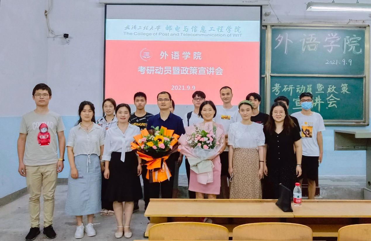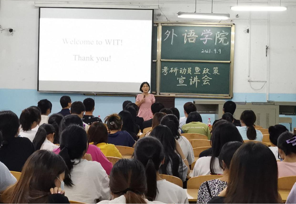 (通讯员:沙沙 温偲睿)为帮助同学们了解考研信息、学习考研技巧、激发考研热情、增强考研信心,2021年9月9日晚,外语学院在1319教室举办了考研动员暨政策宣讲会。会议特别邀请了武汉工程大学外语学院院长助理邓军涛博士、何广惠教授。外语学院院长李春英、教学副院长温偲睿、党总支副书记齐君、团总支书记王敏、辅导员徐晨等参加了本次会议。会议由温偲睿主持,100余名18-19级同学参加了本次活动。