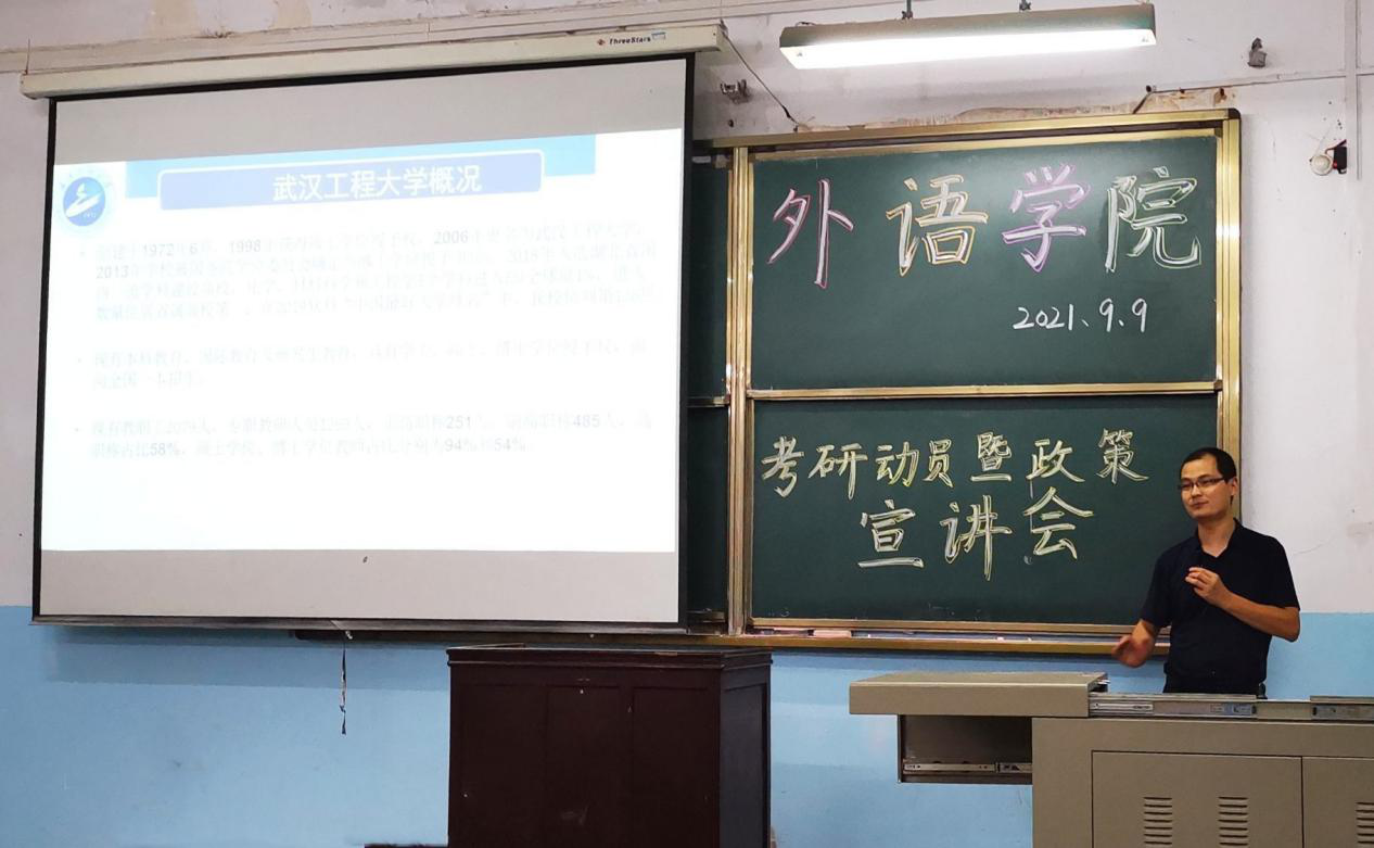 (通讯员:沙沙 温偲睿)为帮助同学们了解考研信息、学习考研技巧、激发考研热情、增强考研信心,2021年9月9日晚,外语学院在1319教室举办了考研动员暨政策宣讲会。会议特别邀请了武汉工程大学外语学院邓军涛副教授、何广惠教授。外语学院院长李春英、教学副院长温偲睿、党总支副书记齐君、团总支书记王敏、辅导员徐晨等参加了本次会议。会议由温偲睿主持,100余名18-19级同学参加了本次活动。