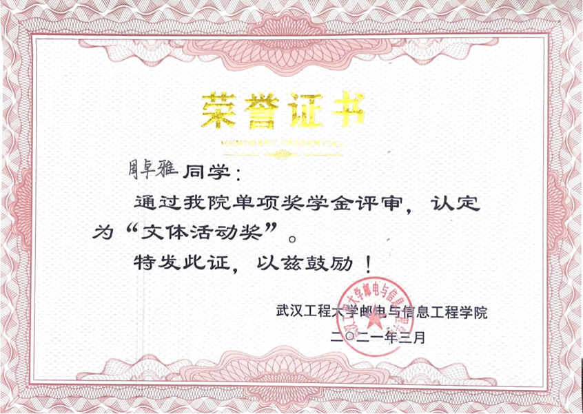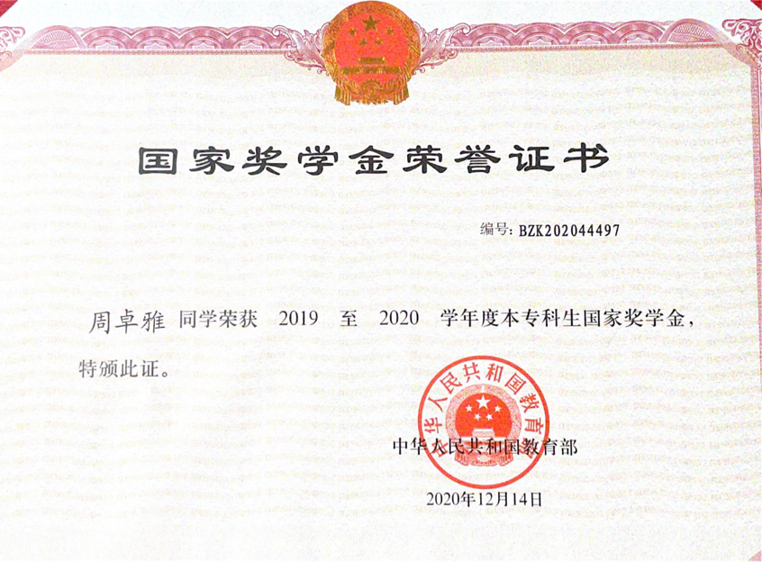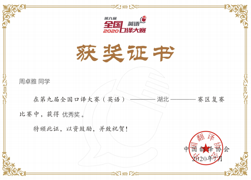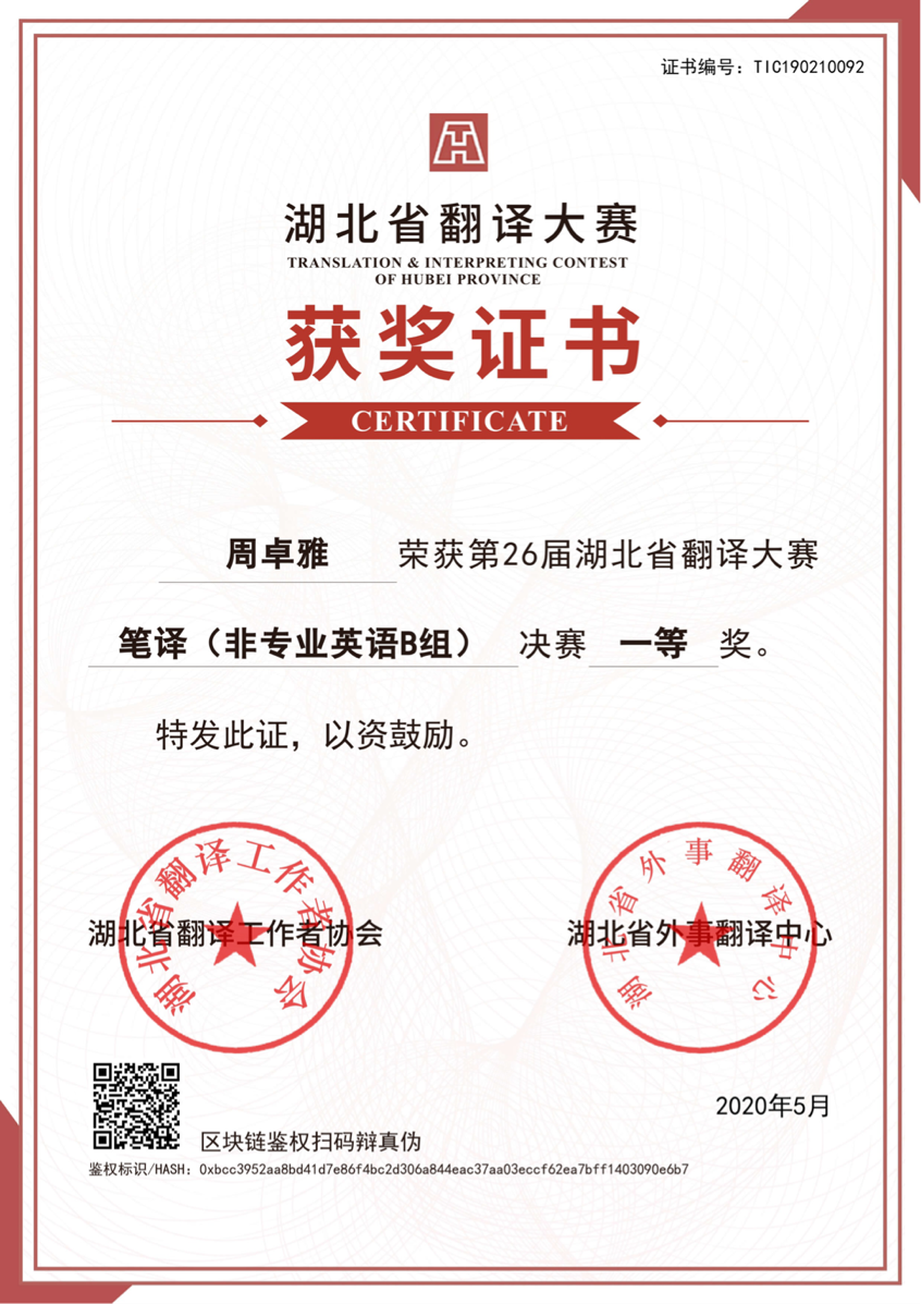 大一时,她就为自己立下一个又一个小目标。首先,便是认真学习专业知识。她的学业平均成绩连续三年排名年级专业第一,曾获得国家奖学金,学院特等奖学金、乙等奖学金以及“三好学生标兵”荣誉称号;其次,她认为,作为新时代的英语专业学生,更应加强思想理论武装,追求创新。在课余时间,她参加多项学科竞赛并取得了优异成绩。在第26届湖北省翻译大赛笔译(非专业英语B组)决赛一等奖,在第九届全国英语口译大赛湖北赛区复赛中荣获优秀奖。在完成这些小目标后,她也具备了英语专业学生的基本能力,即通过大学英语四、六级及英语专业四级考试。