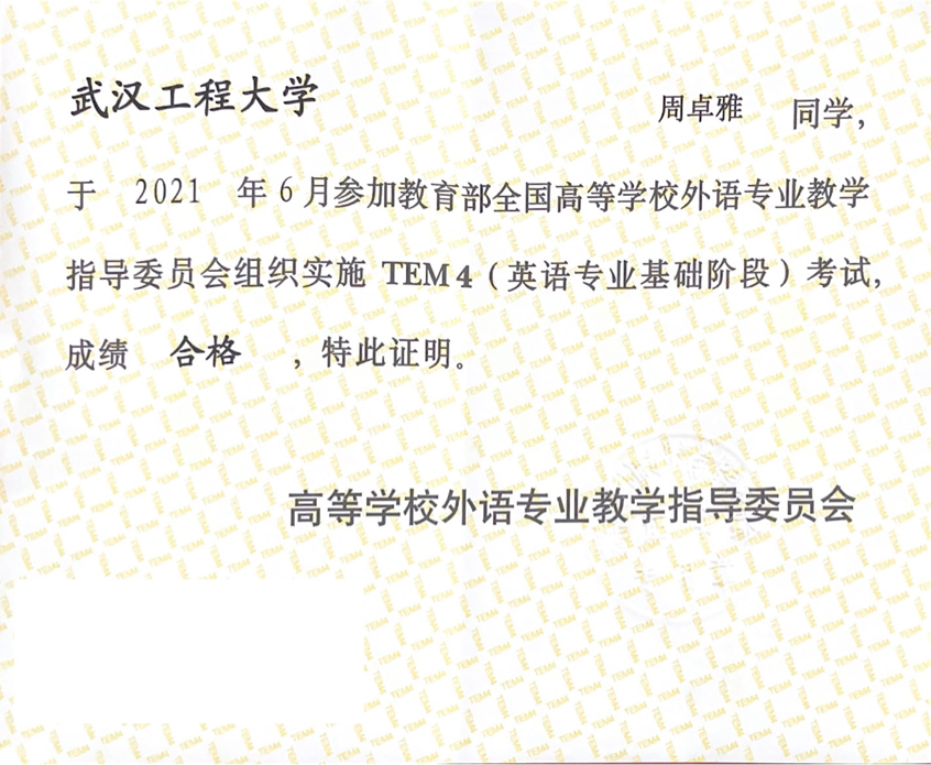 周卓雅,女,湖北荆门人,中共党员,2018级英语02班学习委员。在2022年全国硕士研究生招生考试中,初试成绩409分,复试成绩88.2分,最终以总分83.72分、排名第三的成绩被武汉工程大学英语笔译专业录取。
