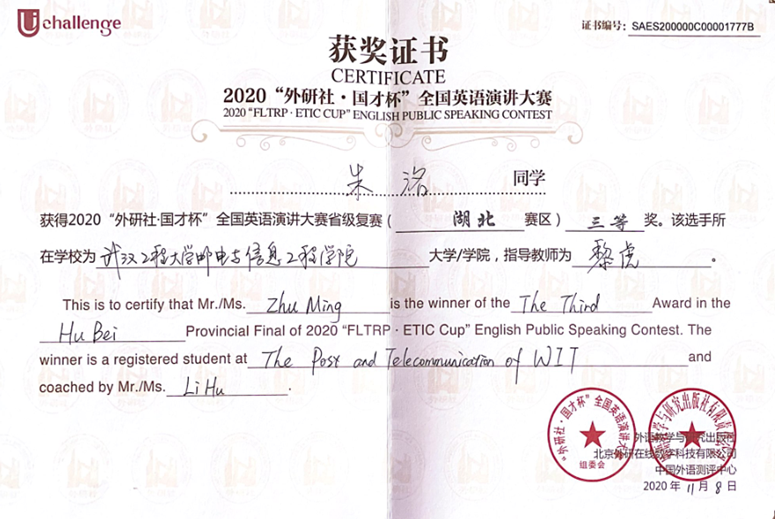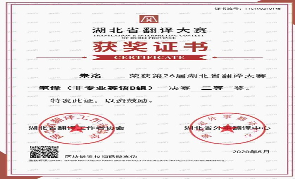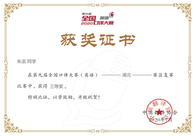 在校期间,朱洺荣获2021年国家奖学金,曾连续两年获得学院甲等奖学金,一次获得“三好学生标兵”、两次获得“三好学生”荣誉称号。顺利通过了全国大学英语四六级考试,TEM4成绩良好。荣获第26届湖北省翻译大赛笔译(非专业英语B组)决赛二等奖,第九届全国口译大赛(英语)湖北赛区复赛三等奖、南部赛区大区赛优秀奖,2020“外研社•国才杯”全国英语演讲大赛省级复赛湖北赛区三等奖。 ![]() ![]() ![]() ![]() ![]() ![]() ![]() ![]() ![]()
