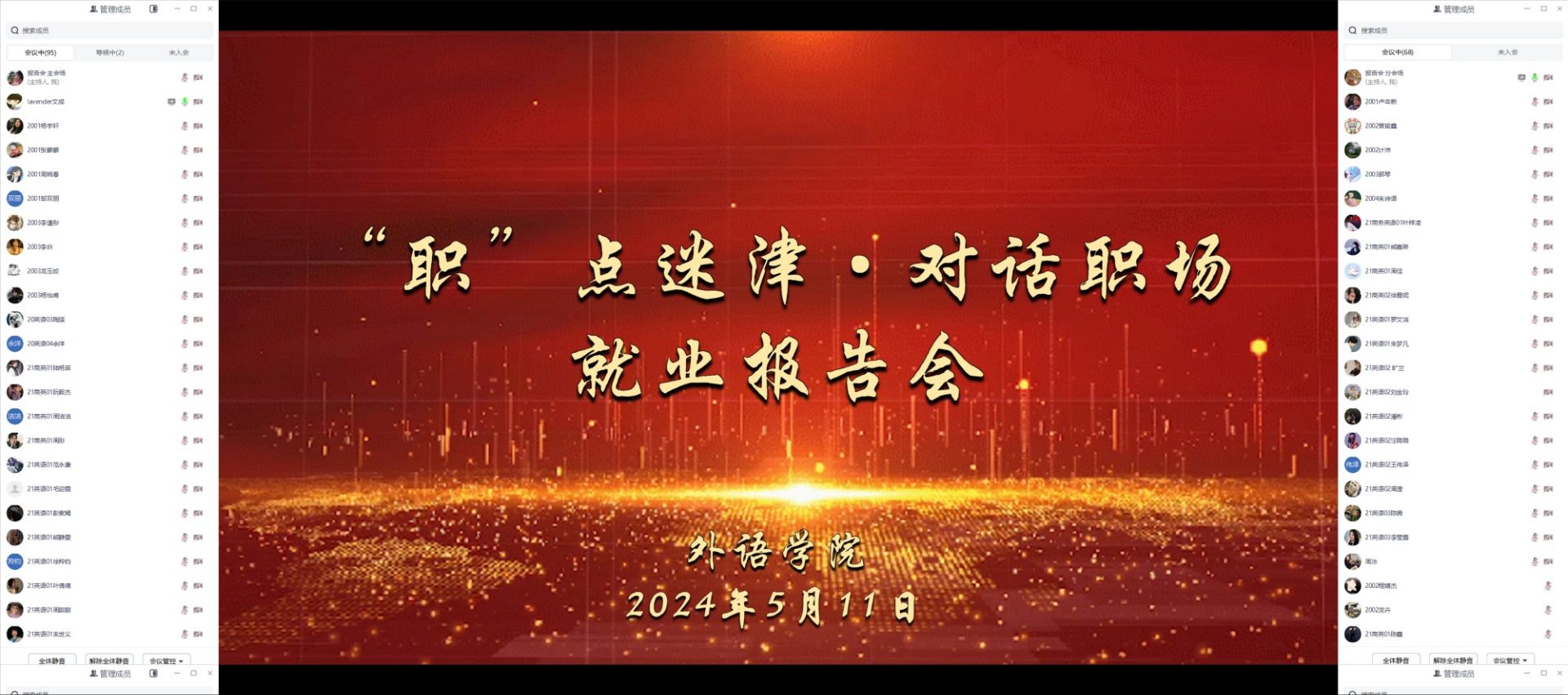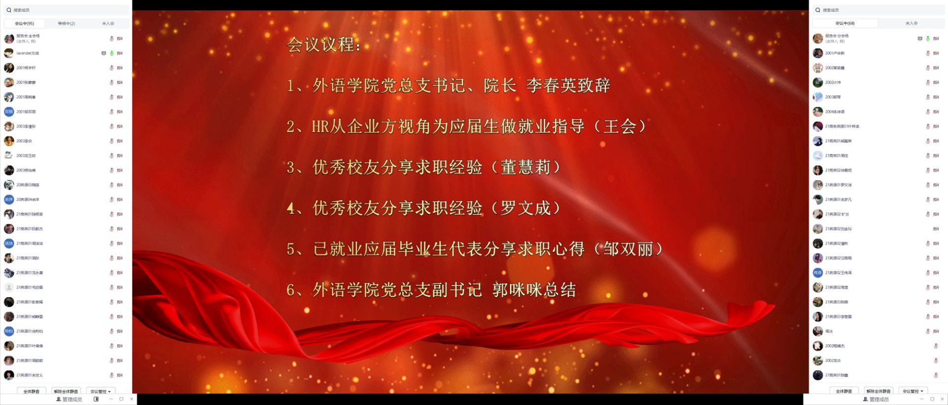 为进一步凝聚共识,帮助学生树立正确的就业观念,推进2024届毕业生充分高质量就业,2024年5月11日晚,外语学院在腾讯会议开展“‘职’点迷津,对话职场”就业报告会。外语学院党总支书记院长李春英、党总支副书记郭咪咪、全体辅导员、毕业班班主任以及2024届毕业生、2021级在校生参加本次会议,会议由学工办主任王敏主持。![]() 会议邀请了广东飞更远网络科技有限公司校企部主任王会、2017届优秀校友董慧莉、2015届优秀校友罗文成为同学们分析就业形势、指导就业规划、解答就业困惑。 会议首先由外语学院党总支书记、院长李春英致辞,对应邀参加本次会议的企业HR及优秀校友表达欢迎和感谢,强调高校毕业生就业工作事关国家大计和民生福祉,号召同学们认清就业形势,脚踏实地稳就业。 ![]() 广东飞更远网络科技有限公司校企部主任王会为学生分析就业前景,从企业HR的视角对学生进行就业指导。 ![]() 上市公司晶科能源股份有限公司销售经理董慧莉作为2017届优秀校友代表向学弟学妹分享个人求职经验和工作感悟,并分析00后职场适应及发展规律。 ![]() 深圳市飞速创新技术股份有限公司销售经理罗文成作为2015届优秀校友代表向学弟学妹分享她的就业选择和奋斗经历,传递适应职场的正能量。 ![]() ![]() 已就业应届毕业生代表邹双丽从自我认知、职业规划、求职技巧、求职心理调适等方面分享求职经验。最后党总支副书记郭咪咪做会议总结,她鼓励并祝愿2024届毕业生顺利找到满意的工作。 本次就业报告会有利于2024届毕业生进一步认识当前就业形势,也为同学们提供了多种就业思路,帮助学生树立正确的就业观,促使毕业生尽早明确职业意向,尽快实现稳定就业。 通讯员:王敏 审核人:郭咪咪 编辑:黄吉佳 (责任编辑:admin) |