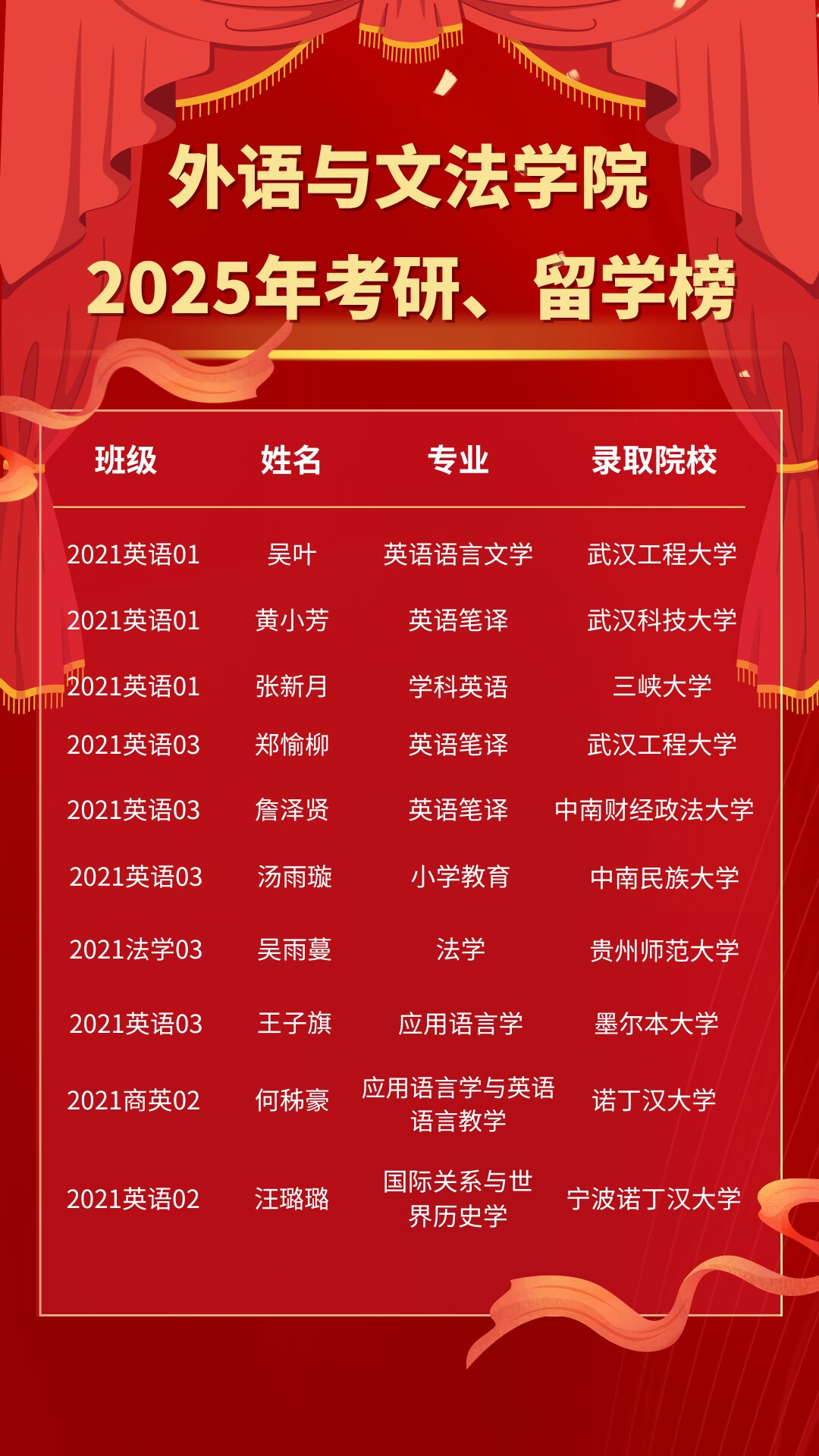 政治面貌:共青团员 专业班级:2021商务英语02 导师:李春英 班主任:赵亦杨 录取专业:应用语言学与英语语言教学 考取院校:诺丁汉大学 座右铭:多做点自己真正想做的事 ![]()