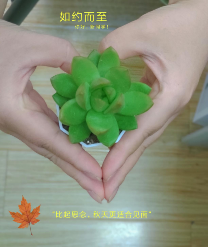 9月24日-9月25日 ,外小芊将与萌新见面啦!志愿者将会将多肉连同新生礼包一起发放,希望它作为你的伙伴,陪伴你度过大学时光。“外小芊”在你们来之前的两周里努力生长,先去了生机盎然的叠翠湖增长视野,又去了活力四射的操场、香飘十里的食堂、明亮整洁的教室,最后在这里等待你的到来,期待与你见面,想要告诉你它所有的新奇感受,并期待与你一起去实现未知的神秘约定……
