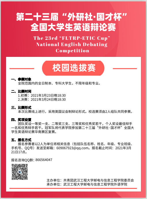 根据全国大学生英语辩论赛组委会《关于启动第23届“外研社·国才杯”全国大学生英语辩论赛的通知》精神,为引导高校广大青年学生积极践行社会主义核心价值观,加强高校校园文化建设,促进各学院之间的交流,帮助学生开拓国际视野,强化学习意识,提升英语表达能力、思辨能力和团队协作能力,拟定于2021年3月下旬举办304永利集团英语辩论校选赛。现将有关事项通知如下: 一、参赛对象 全院范围内的全日制本、专科大学生,不限年级和专业。 二、报名方式 校选赛须由2人组队共同参赛。报名参赛者以2人(均为邮电学院在校大学生)为单位填写报名表(附件1),于2021年3月21日17:00之前发送至邮箱:609067923@qq.com。(联系人:黄老师;联系电话:15071076681;报名咨询QQ群:866564047)。 三、时间安排 (一)报名时间:2021年3月13至2021年3月21日; (二)赛前培训:2021年3月21日(线上培训具体时间待定); (三)初赛:2021年3月23日晚18:30; (四)决赛:2021年3月24日晚18:30。 四、比赛方法 本次比赛线上进行。经过初赛后,选拔4 支队伍晋级校选赛决赛,决赛冠军队伍将代表学院参加第二十三届“外研社·国才杯”全国大学生英语辩论赛华南赛区复赛。 五、奖项设置 本次比赛将评选出团队奖和个人奖。团队设一等奖(一支队伍)、二等奖(三支队伍)、三等奖(若干)和优秀奖(若干)。个人设最佳辩手奖(一名)和优秀辩手奖(若干)。所有获奖团队及个人将获得组委会提供的证书和奖品。 六、相关要求 (一)参赛选手必须使用电脑或者平板电脑参赛,电脑配置摄像头、麦克风,不可使用手机参赛。比赛时须选择环境安静和网络良好的场所,与同学、家人提前沟通避免干扰。 (二)本次辩论赛将采用腾讯会议作为比赛平台。参赛人员须提前下载、安装并注册腾讯会议,熟悉腾讯会议软件的使用方法,确保摄像头和麦克风都可以在比赛全程正常使用。 (三)参赛人员应遵守比赛纪律和比赛规则(辩手规则参见附件2),服从工作人员安排,尊重评委评判。 ![]()