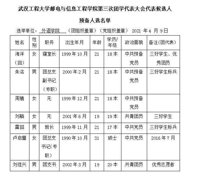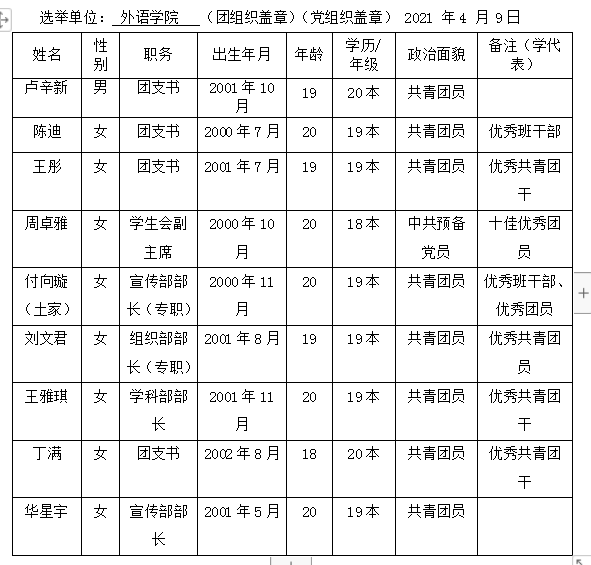 外语学院团总支按照预分方案的代表名额及构成要求,召开本单位所属各团组织负责人会议,采取自下而上推荐,上下结合,反复酝酿的方式,根据多数团组织或团员青年的意见,提出了代表候选人预备人选初步名单,经本单位党组织同意后,在本单位征求了各所属团组织和大多数团员青年的意见,按照选举代表一般不少于20%的差额比例,提出代表候选人预备人选初步名单16名,其中,男代表4名,占25%,女代表12名,占75%;中共党员(含预备党员)7名,占44%,共青团员9名,占56%;少数民族代表2名,占13%;团的专职工作者4名,占25%。![]() ![]() |