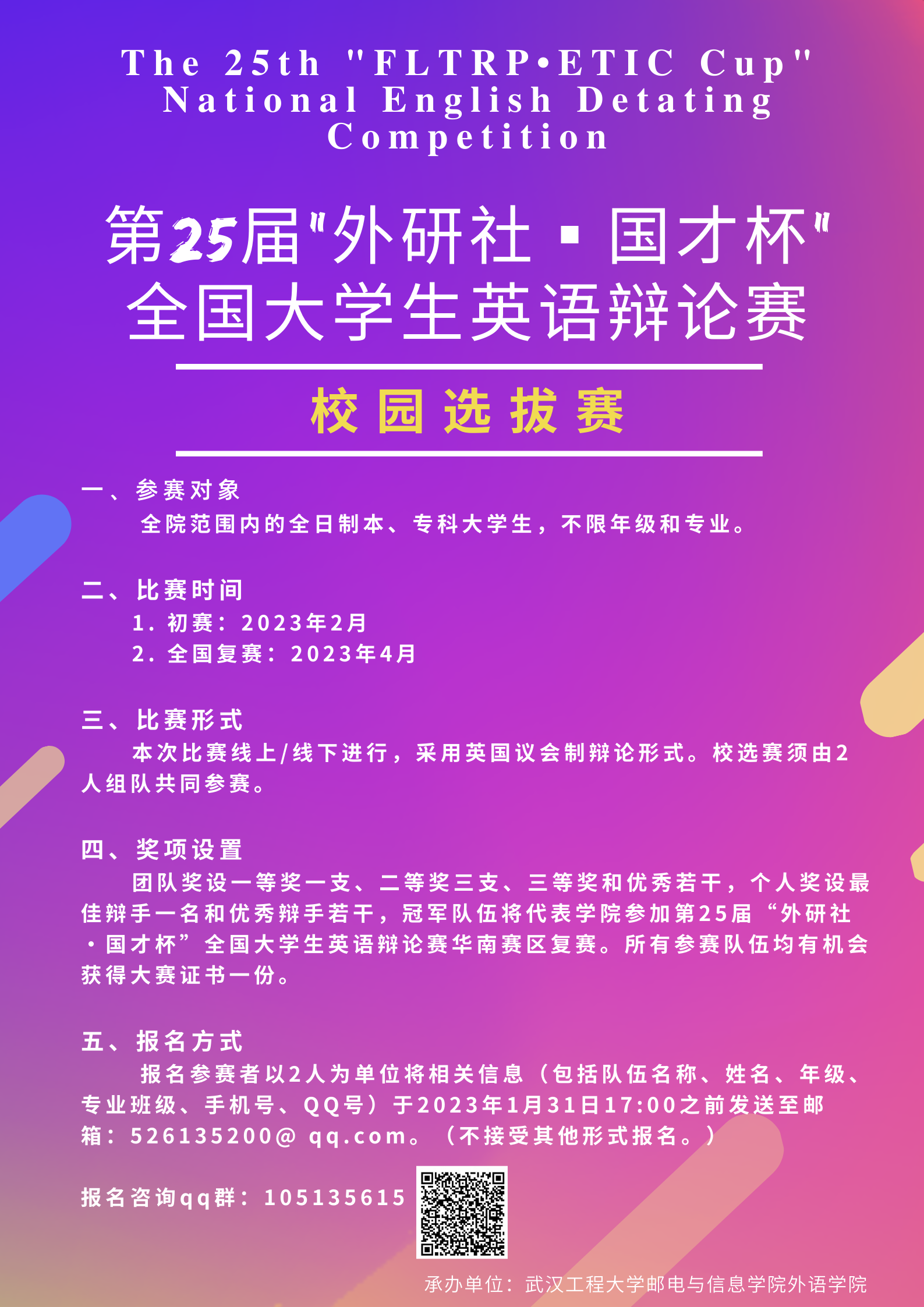 ![]() 引导高校广大青年学生积极践行社会主义核心价值观,加强高校校园文化建设,促进各学院之间的交流,帮助学生开拓国际视野,强化学习意识,提升英语表达能力、思辨能力和团队协作能力。 二、比赛举办单位 主办方:304永利集团外语学院 三、比赛时间 1.校园选拔赛:2023年2月,具体时间另行通知。 2.全国复赛:2023年4月,具体以官方比赛时间为准。 四、比赛地点 本次比赛采取线上/线下相结合的方式进行。线上比赛时参赛选手须使用电脑,提前下载、安装并注册腾讯会议,确保摄像头和麦克风都可以在比赛全程正常使用;线下赛场安排另行通知。 五、比赛安排 每支参赛队伍由2人组成(辩手规则参见附件一)。外语学院将于2023年2月举办赛前培训会。2023年3月的校选赛将评选出一、二、三等奖(团队奖)和最佳辩手奖(个人奖)。其中冠军队伍将代表学院参加区复赛。所有参加比赛的队伍均有机会获得大赛证书一份。 六、比赛报名 报名条件:比赛面向全院范围内的全日制本、专科大学生,不限年级和专业。 报名时间:即日起至2023年1月31日。 报名方式:报名参赛者以2人为单位填写报名表(附件二),于2023年1月31日17:00之前发送至邮箱526135200@qq.com。(不接受其他形式的报名。) 七、联系人 联系人:胡慧(15927517159)、 郑秀娟(15927601517)。咨询QQ群:105135615。