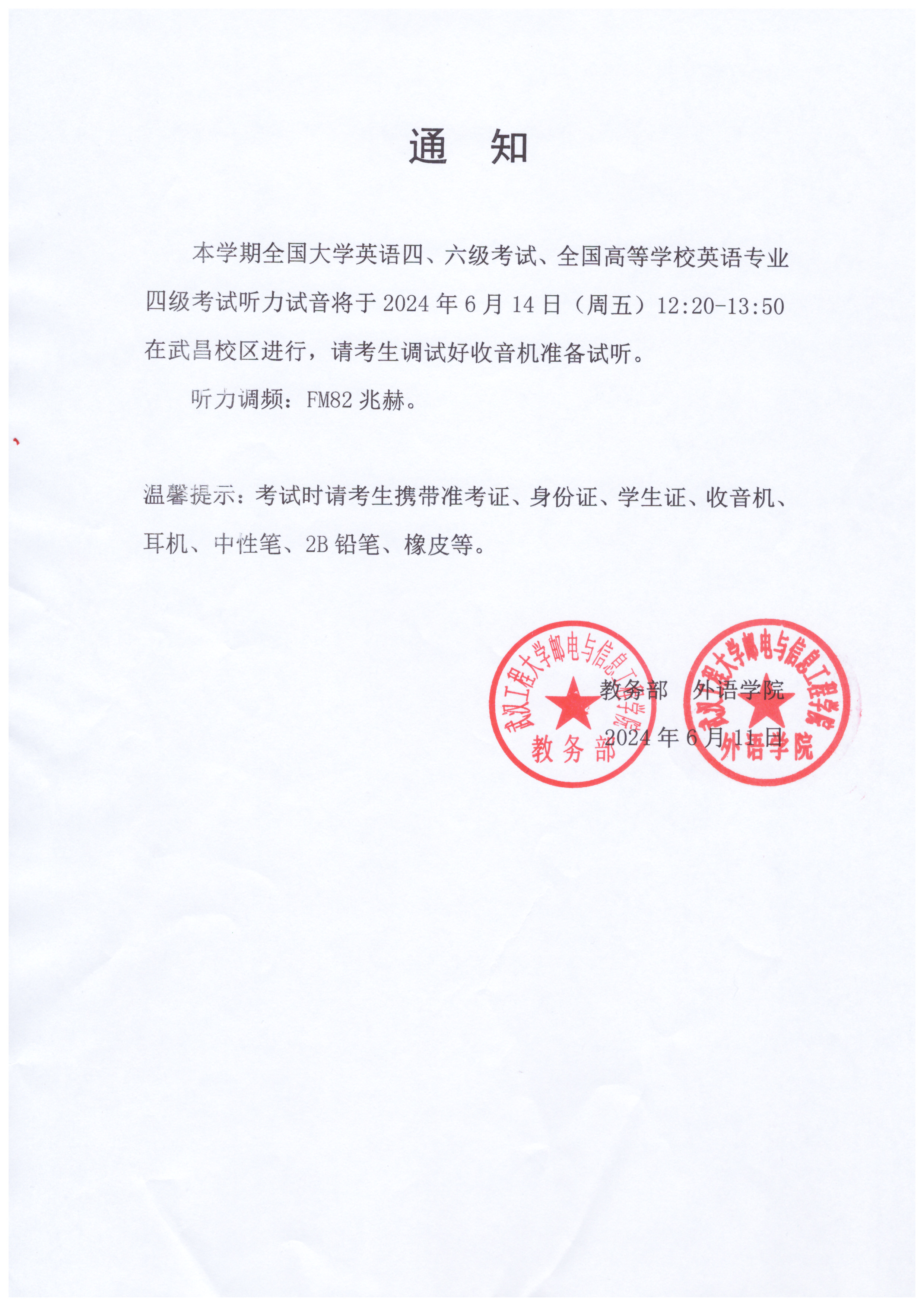 全国大学英语四、六级考试、全国高等学校英语专业四级考试听力试音通知