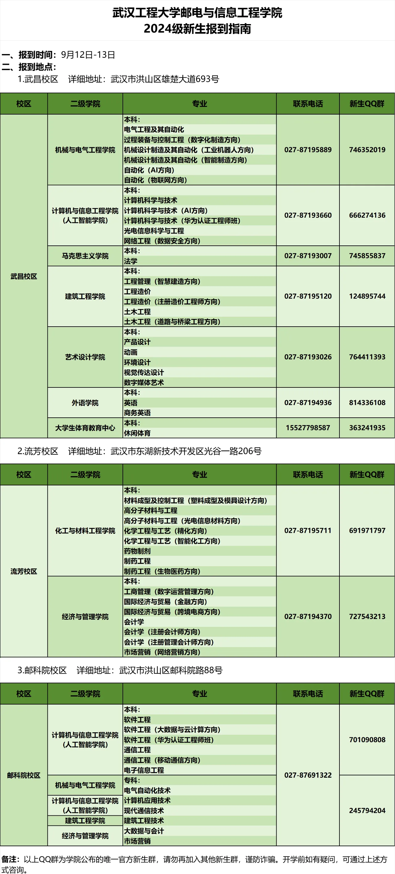 云路鹏程九万里,雪窗萤火二十年。你们怀揣梦想与期待,即将步入大学的校园生活,迎来人生新篇章。全校师生员工怀着无比的期待热切期盼你们的到来! 304永利集团2024级新生开学报到时间为2024年9月12日-13日。经学院研究决定,原流芳校区的机械与电气工程学院、计算机与信息工程学院(人工智能学院)、马克思主义学院、建筑工程学院、艺术设计学院、外语学院本科相关专业2024级新生现场报到地点调整为武昌校区,地址为武汉市洪山区雄楚大道693号。其他二级学院(校区)报到地址不变。 请各位新生同学按调整后的报到地点现场报到。 温馨提示: 1.请同学们根据相应的报到时间和地点妥善安排来校时间和来校方式,来校途中注意安全; 2.新生报到具体注意事项,包括报到地点、报到流程、住宿安排和军训安排等,以相应二级学院通知的为准; 3.近期各二级学院将发布通知,请同学们以录取通知书内新生入学须知里的二级学院联系电话或新生QQ群通知为准,其它渠道信息请勿轻信,以防上当受骗。 ![]() 来源:招生与就业工作部 编辑:黄吉佳 |