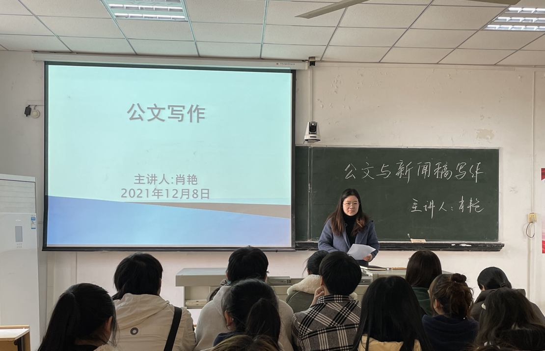 (通讯员:赵亦杨)2021年12月8日下午,外语学院邀请马克思主义学院肖艳老师在1教1308教室举行了一场以“公文写作”、“新闻稿写作”为主题的培训讲座。外语学院全体教师和学生会宣传部的学生代表聆听了讲座,讲座由外语学院副院长温偲睿主持。