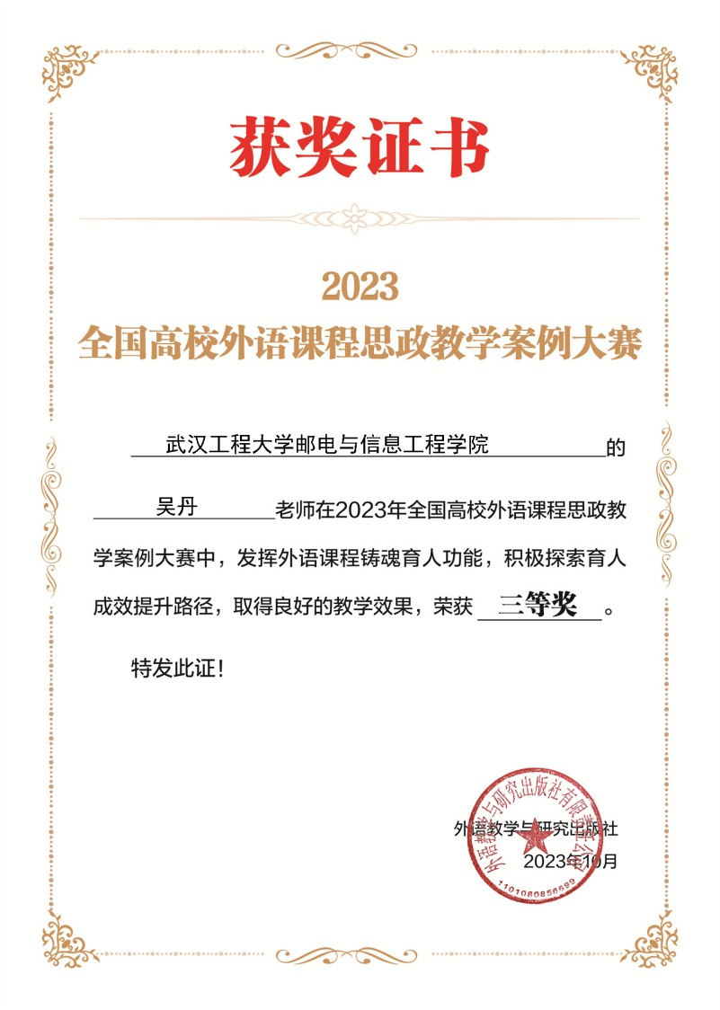 近日,由外语教学与研究出版社举办的2023年全国高校外语课程思政教学案例大赛结果揭晓,外语学院教师吴丹获得三等奖。