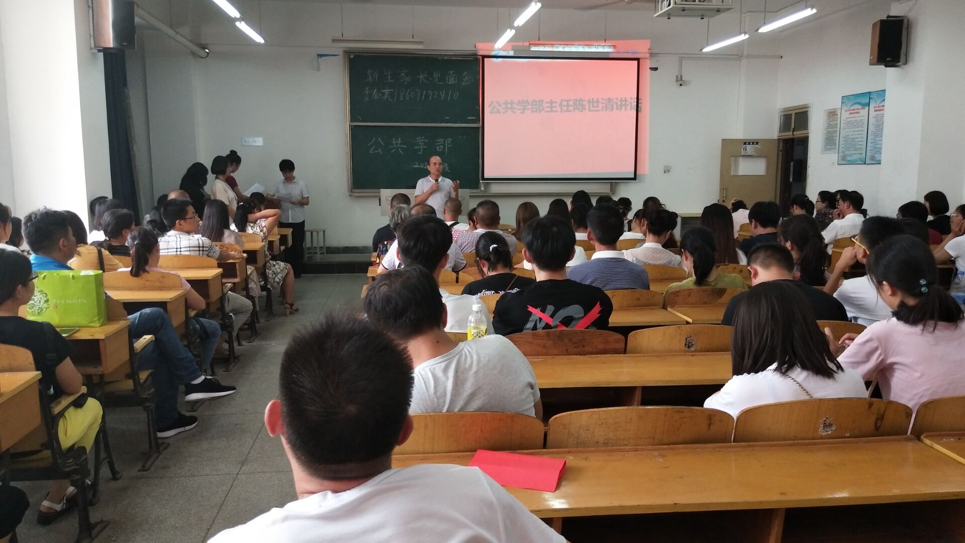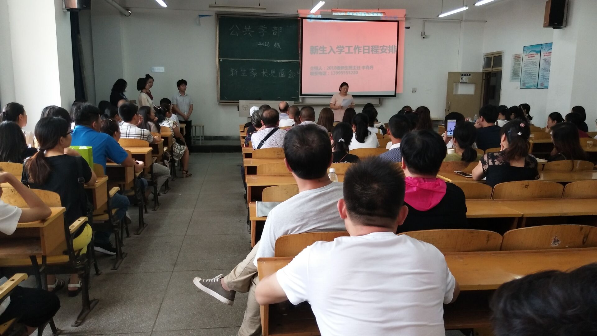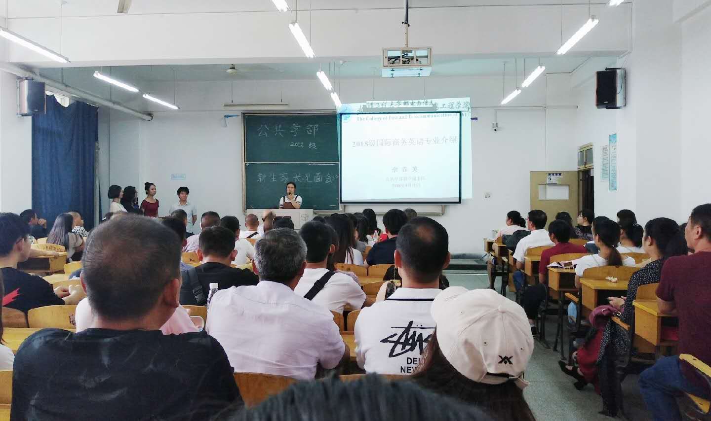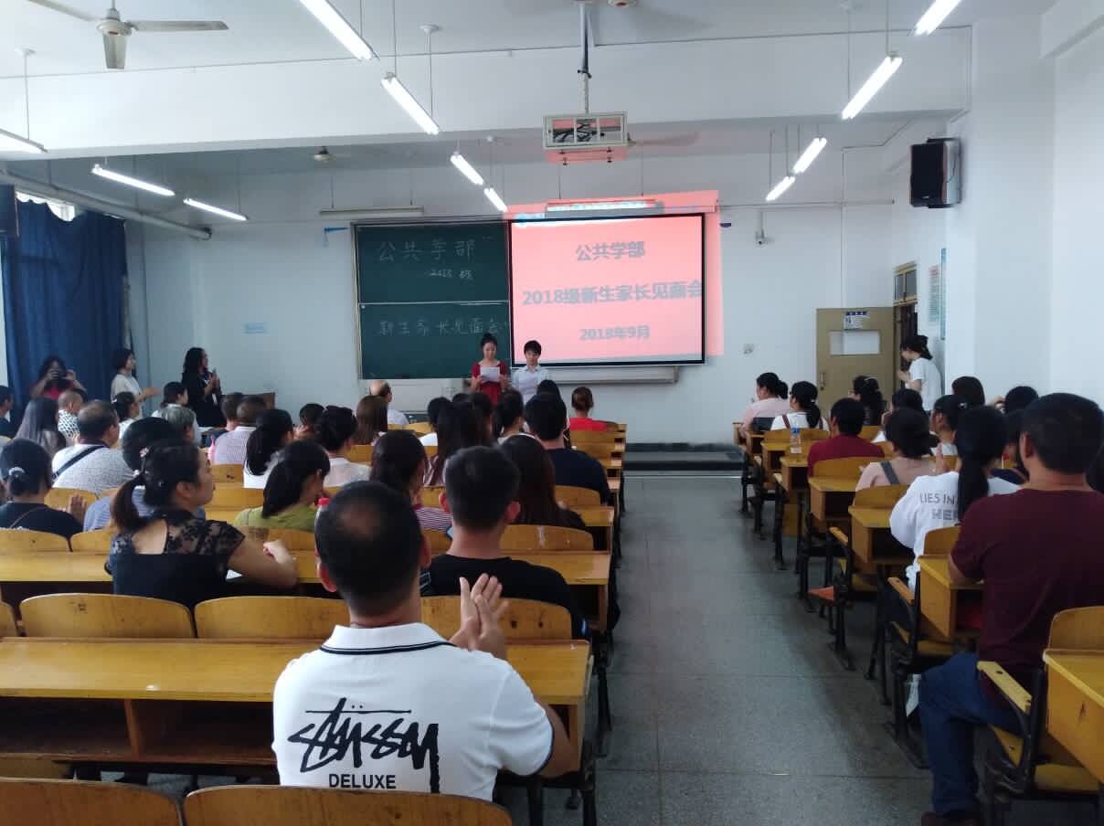 (通讯员:高畅 董杰) 2018年9月11日,我院迎接2018级新生工作井然有序。在这个新生家长云集的日子,为与新生家长更好地沟通,引导新生尽快融入大学生活,当天下午2:00,公共学部在3505教室举行了新生家长见面会。见面会由17级英语3班刘雨宏、18级新生汪雯同学主持。公共学部主任陈世清教授,副主任李春英副教授,英语教研室副主任温思睿老师、18级班主任李肖丹老师以及公共学部辅导员谭桑老师参加了会议,与近百名新生和家长进行了热烈的交流。