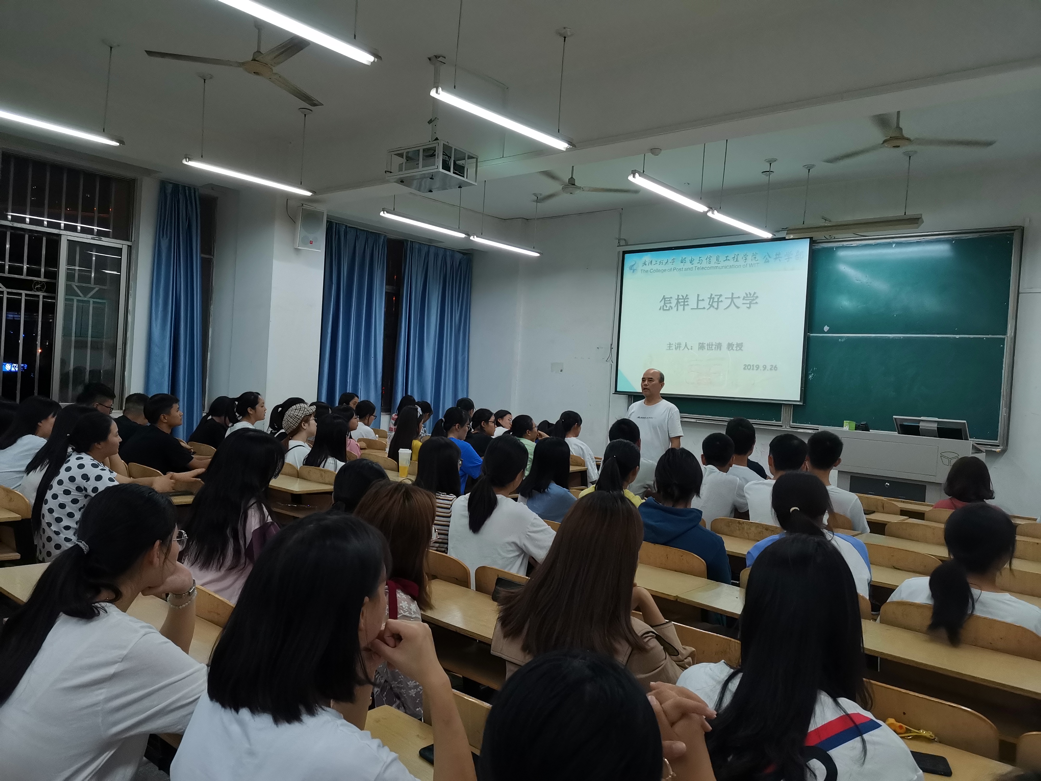 (通讯员:陈珊珊宦紫微)为使2019级新生能更好地适应大学新生活,了解大学生活和学习的特点,懂得在大学要实现自身全面发展的大学目标,2019年9月26日19:00,公共学部党总支书记、学部主任陈世清在3105教室为2019级新生做“怎样上好大学”专题教育讲座。学部2019级辅导员和所有新生约130人参加本次讲座。讲座由学部党总支副书记徐章主持。