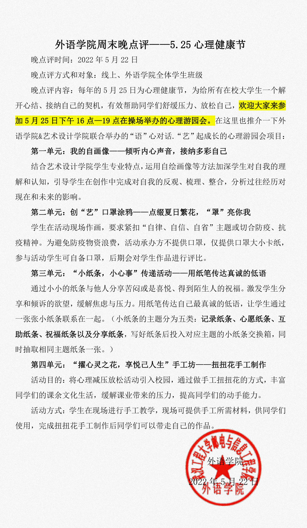 外语学院周末晚点评——5.25心理健康节