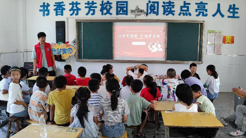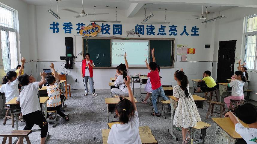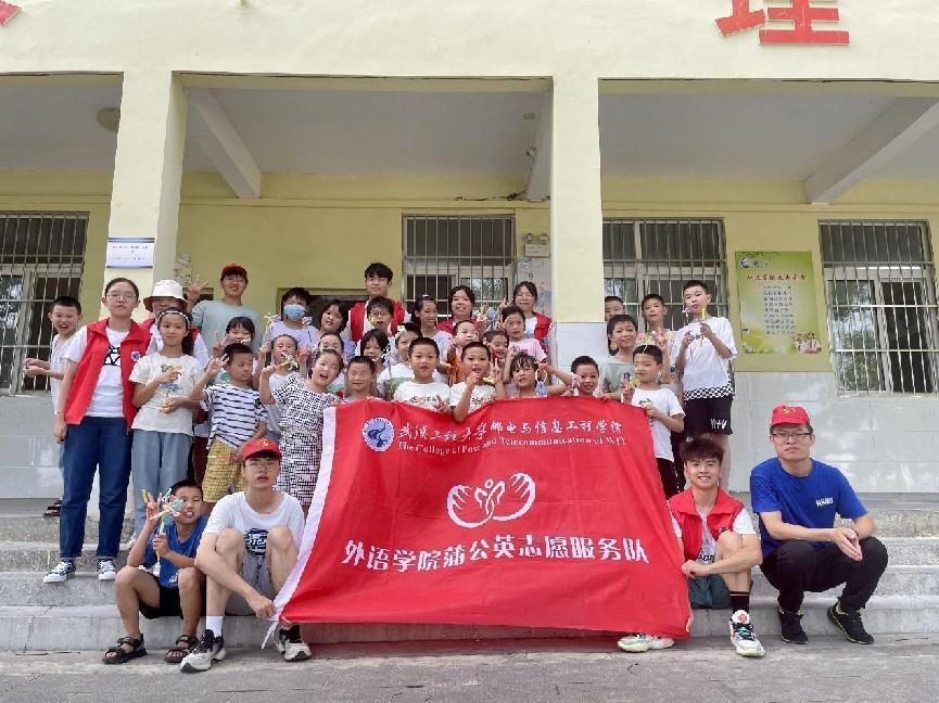 “这是我过得最有意义的一个暑假,在这里,我的专业知识得到发挥,我的社会价值得以实现,看到孩子们灿烂的笑容,我的付出便都值了”,蒲公英志愿服务队队员蔡珺说。蒲公英志愿服务队依据随县尚市镇太山小学的实际情况,开设了“喜迎二十大”为主题的系列“红色课堂”,开课前,志愿者们采用外语学院的特色导师制,和学生双向选择、结对指导,为每一位学生提供针对性的辅导和多元全面的关怀。奋斗驱萧索,不负少年时。青年志愿者们通过特色课堂支教活动,丰富了学生的课程体系,开拓学生的视野,也让他们在学习中汲取力量,帮助他们树立为祖国为人民赤诚奉献的坚定理想信念。