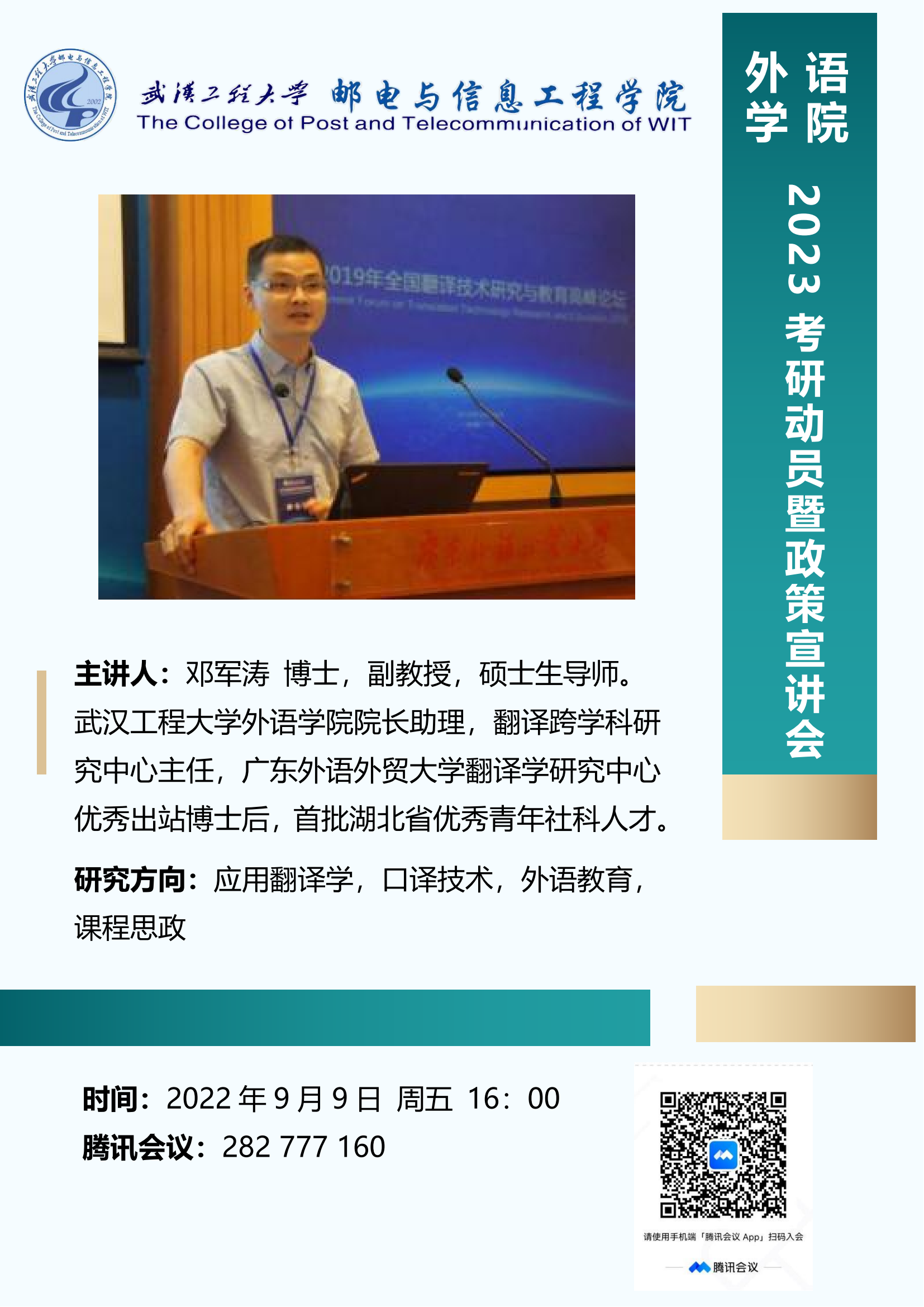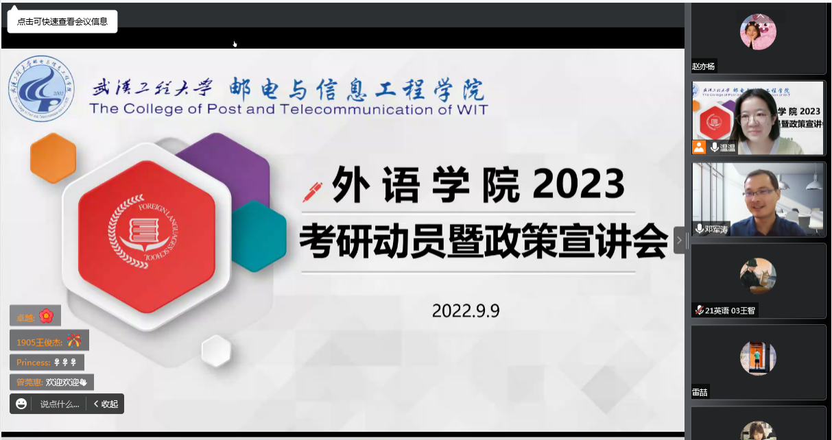 (通讯员:温偲睿)为了帮助考研学生更好地了解当前考研形势与政策,给予专业的备考指导与建议,2022年9月9日下午,外语学院在线上举办了2023考研动员暨政策宣讲会。会议特别邀请武汉工程大学外语学院邓军涛博士作为主讲嘉宾。外语学院院长李春英、教学副院长温偲睿、毕业班班主徐晨和部分专任教师参加了本次会议。会议由副院长温偲睿主持,外语学院各年级近150名同学参加了本次宣讲会。