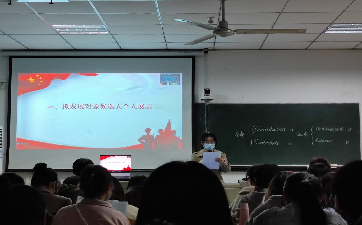 为进一步严格发展学生党员标准,规范发展学生党员工作程序,提高发展学生党员质量,2022年10月6日下午外语学院在一教1308教室召开外语学院第三党支部拟发展对象候选人展示会。参加本次会议的有外语学院党总支副书记齐君、党委组织部何瑞丽、党委组织部杨春、外语学院第三党支部书记王敏、外语学院辅导员徐晨、全体学生党员以及入党积极分子,本次会议由学生党员李梓萌主持。