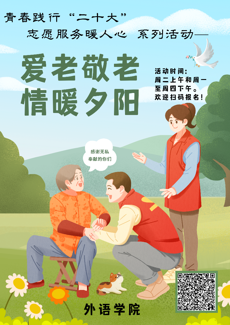 (通讯员 蒋思凤)春风解冻,迎来送往;寒冬散尽,花开日暖。又是一年雷锋日,志愿服务正当时。2023年3月5日是第60个学雷锋纪念日,也是第24个中国青年志愿者服务日。为深入学习宣传贯彻党的二十大精神,贯彻落实习近平总书记近日对深入开展学雷锋活动作出的重要指示精神,外语学院开展青春践行二十大·志愿服务暖人心系列活动,让学雷锋在青年学子中蔚然成风。 【活动名称】 爱老敬老·情暖夕阳 【活动时间】 每周周一到周四下午、周二上午。 【活动地点】 湖北省医养康复中心 【活动内容】 由蒲公英志愿服务队组织志愿者到湖北省医养康复中心为荣誉伤残军人、社会孤寡老人、临终关怀和社会医养老人开展心理疏导和陪伴,给予老人力所能及的生活照料和精神关爱。 【报名方式】