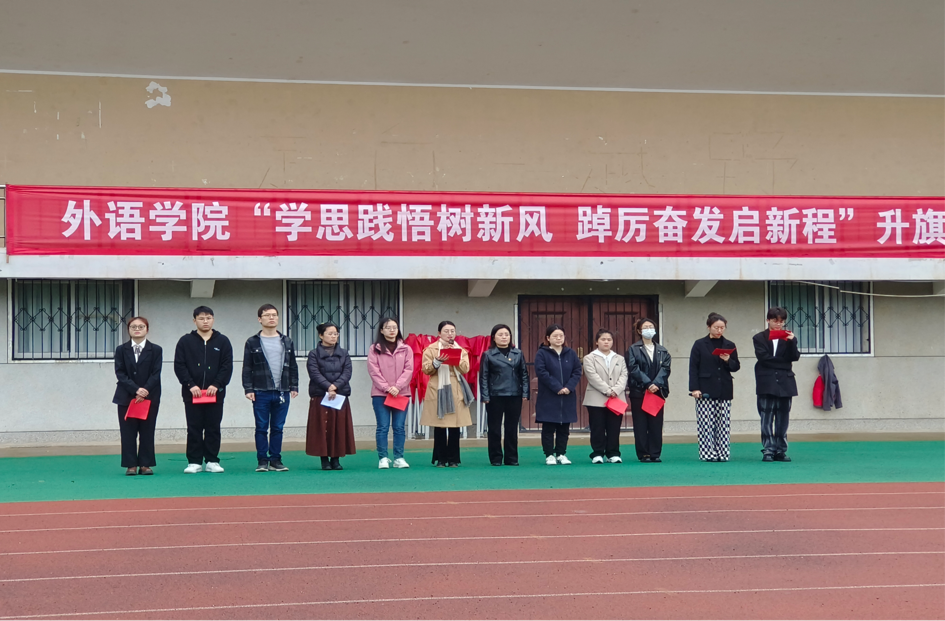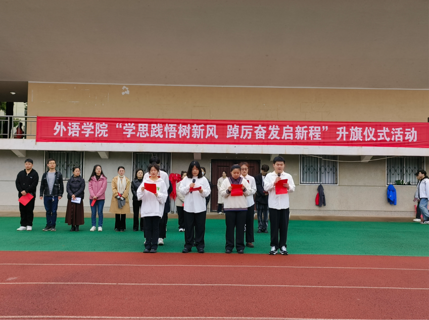 为深入贯彻落实习总书记在党的二十大报告中有关教育的新理念新思想新观点,进一步推进学院学风建设,努力培养德智体美劳全面发展的社会主义建设者和接班人。2023年4月23日早晨7:00外语学院在田径场举行了“学思践悟树新风·踔厉奋发启新程”学风建设主题升旗仪式。外语学院党总支书记、院长李春英、副院长温偲睿、副书记齐君、团总支书记王敏、辅导员徐晨以及外语学院全体在校学生参加了本次升旗仪式。