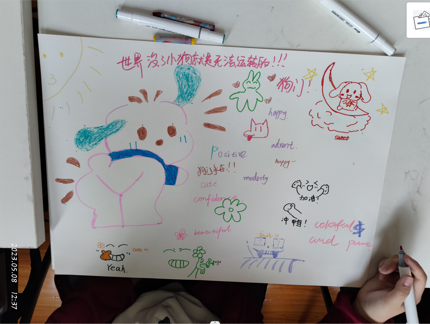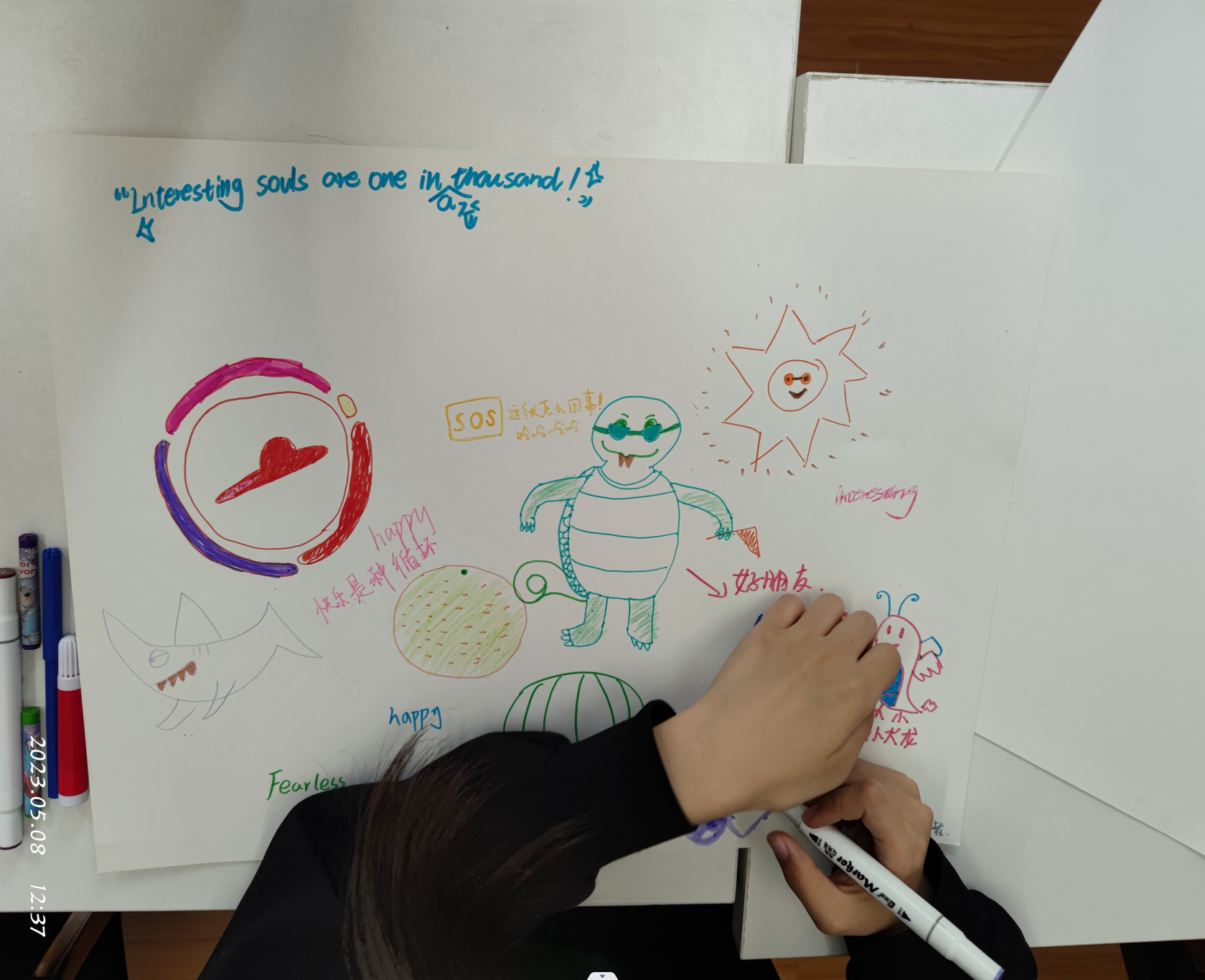 第二阶段的“自画像”团体辅导活动中,齐老师请在座的同学们在白纸上画出能够代表自己的事物,即自己的自画像,同时附上五个自我标签。在完成基础版本的“自画像”后,通过“风吹画”把画传给下一位,并且接着上一位成员的画作继续画图,以此不断继续,音乐不停。一轮过后,当画作重新回到自己的手中时,请大家仔细观察重回手中的画作,并就团辅的主题、形式、内容及感受进行真诚分享。