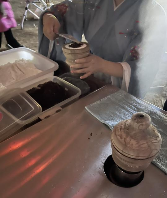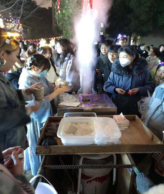 一捧米粉,袅袅白雾。烟火气十足的鼎糕制作摊前吸引了不少同学,身着汉服的大学生熟练地制作鼎糕,将一份份中式传统糕点带给好奇心满满的同学们。