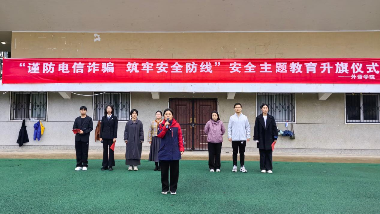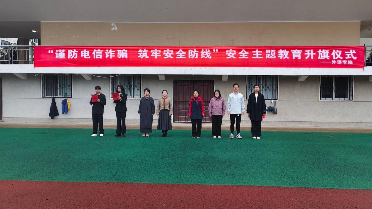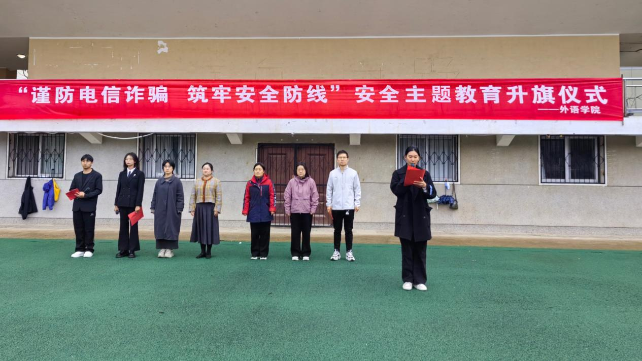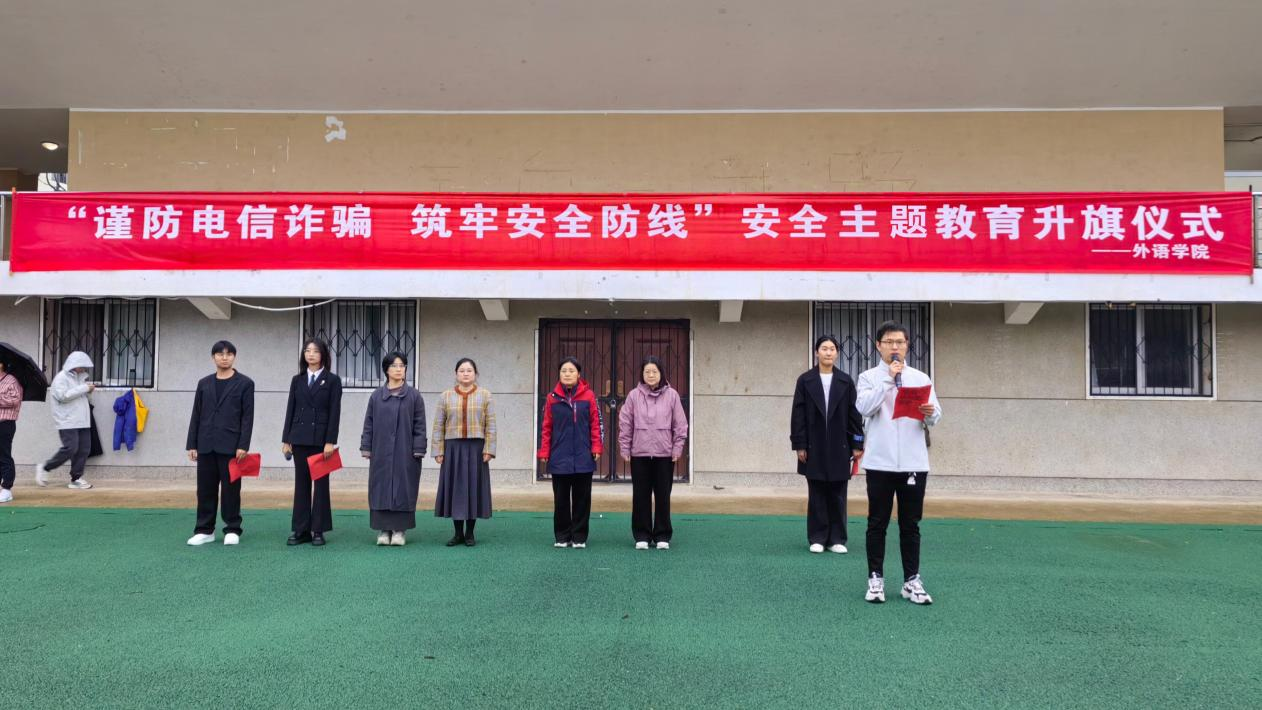 为进一步加大校园反诈宣传力度,普及反诈知识,增强诈骗防范意识,营造平安和谐的校园环境,外语学院于2024年11月18日早晨7时举行以“谨防电信诈骗 筑牢安全防线”为主题的升旗仪式。外语学院班子成员、全体辅导员及全体在校学生参加了升旗仪式,升旗仪式由学生代表郭慧英、陈书豪主持。