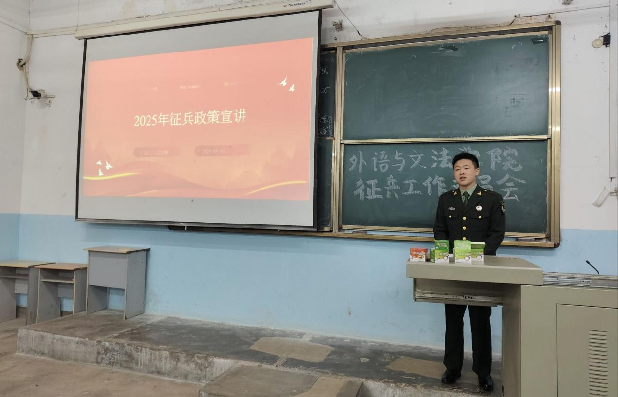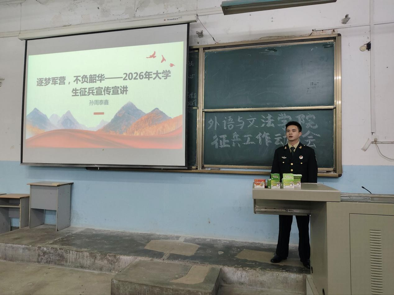 最后,徐晨老师作总结动员。他进一步阐释了新时代大学生投身国防建设的重要意义,鼓励同学们把握参军入伍的宝贵机遇,勇于突破自我、接受磨砺,积极投身强军兴军伟大事业,为实现强国梦、强军梦贡献青春智慧与力量。 此次宣讲会是外文学院深化国防教育、推进征兵工作的重要举措,旨在厚植家国情怀,激发青年学子参军报国的责任感与使命感。下一步,学院将持续优化征兵宣传工作机制,加强服务保障,积极引导和鼓励更多有志青年携笔从戎、报效国家。