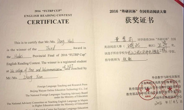 公共学部英语专业2013级董慧莉同学荣获2016“外研社杯”全国英语阅读大赛(湖北赛区)三等奖,指导教师张献。