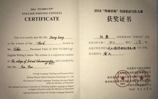 公共学部英语专业2013级张康同学荣获2016“外研社杯”全国英语写作大赛(湖北赛区)三等奖,指导教师潘凡。