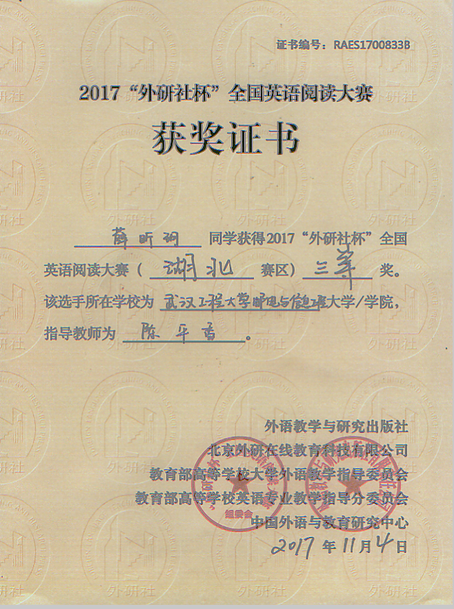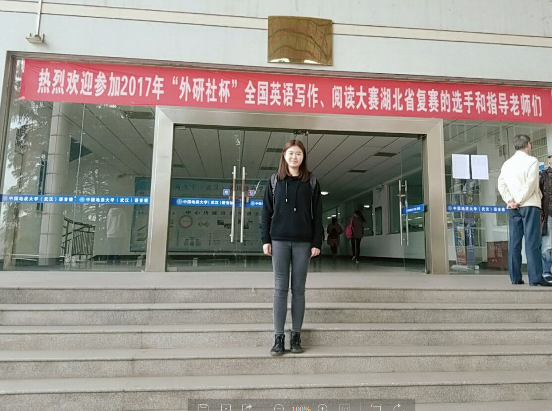 (通讯员 陈平香)2017年“外研社杯”全国大学生英语写作、阅读比赛湖北省复赛于11月4日在中国地质大学(武汉)举行。我院公共学部15级曹星媛同学、14级薛昕玥同学在指导老师何琴、陈平香的带领下代表我院参加了此次比赛,与来自武汉大学、华中科技大学、华中师范大学等全省55所高校的55名参赛选手同台竞技,经过紧张的角逐,曹星媛同学荣获写作比赛二等奖、薛昕玥同学荣获阅读比赛三等奖。