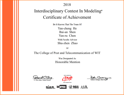 (通讯员:赵淑珍)2018年国际大学生数学建模竞赛(MCM/ICM)成绩于日前揭晓,由我院公共学部数学教研室赵淑珍指导的何燕成、陈彦茹、沈柏安团队荣获国际二等奖(Honorable Mention),这是我院首次参赛并获奖。 MCM/ICM是一项国际级的学科竞赛,也是现今所有数学建模竞赛鼻祖,由美国数学及其应用联合会(COMAP)举办,得到了美国工业与应用数学学会(SIAM),美国数学会(MAA),美国运筹学和管理学研究协会(INFORMS),美国统计学会(ASA)等多个组织的赞助和支持。2018年的比赛吸引了来自全球19个国家和地区,包括哈佛大学、哥伦比亚大学、清华大学、北京大学等著名高校的20602支队伍参赛。