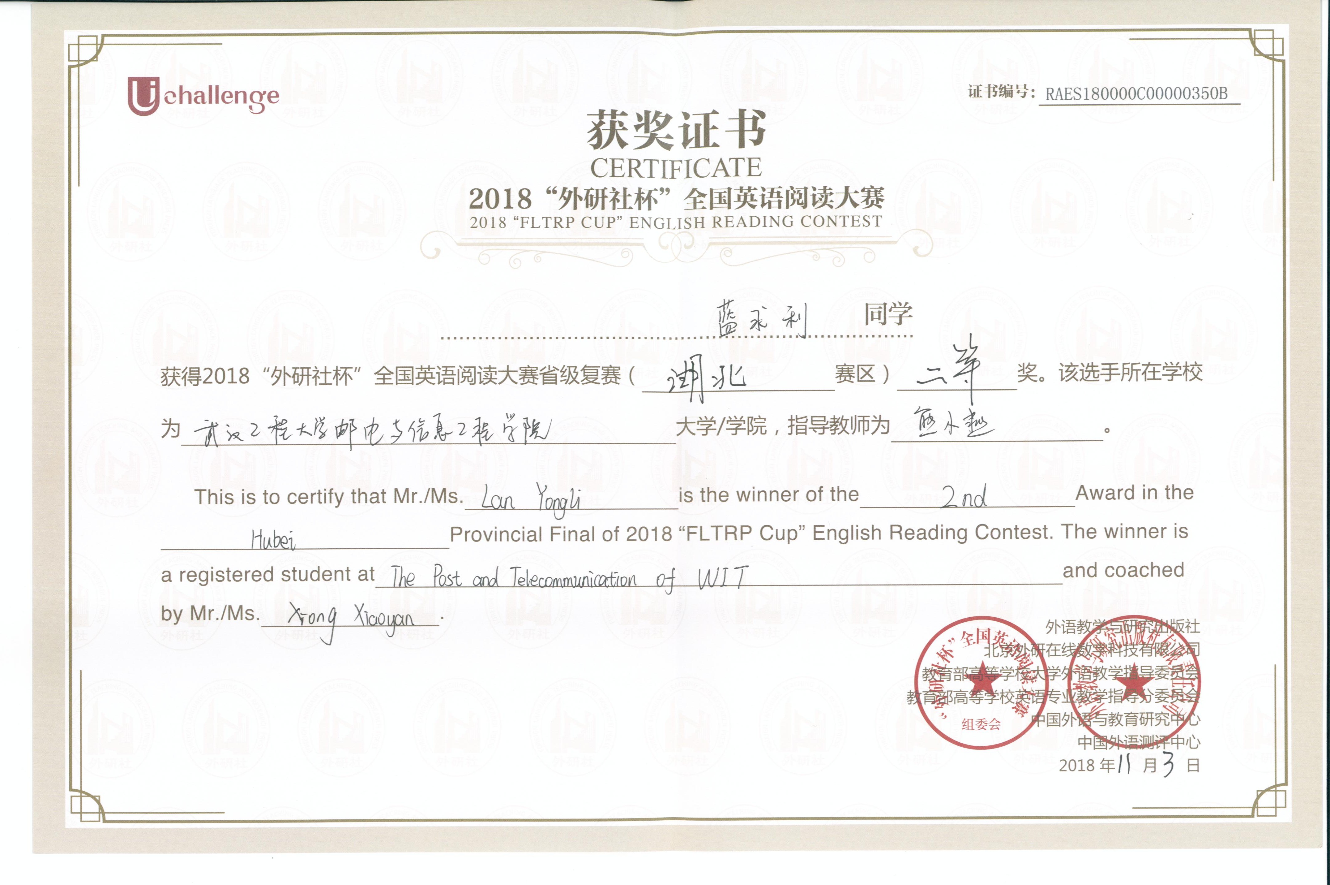 (通讯员 蓝永利)2018年“外研社杯”全国英语写作、阅读大赛湖北省复赛于11月3日在中国地质大学(武汉)举行。公共学部15级曹星媛同学、16级蓝永利同学分别在指导老师桂文娟、熊小燕的带领下代表我院参加了此次比赛,与来自武汉大学、华中科技大学、华中师范大学等全省58所高校的58名参赛选手同台竞技,经过紧张的角逐,曹星媛同学荣获写作比赛三等奖,蓝永利同学荣获阅读比赛二等奖。![]() ![]() 本次湖北地区复赛实行机考模式,综合考查学生的读写能力和英语基本功以及临场应变能力。我院参赛的选手们积极准备,沉着应战,书写个人见解,读出万千感悟,赢得了现场评委的一致肯定。 ![]() ![]()