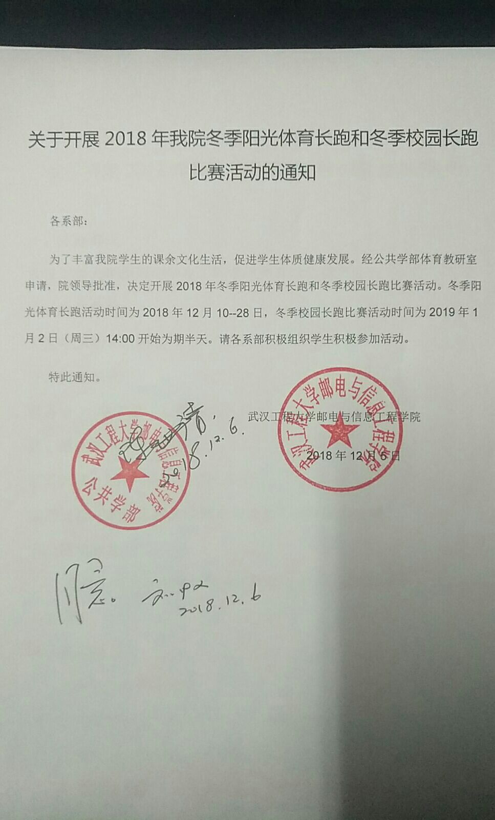 各系部: 为了丰富我院学生的课余文化生活,促进学生体质健康发展。经公共学部体育教研室申请,院领导批准,决定开展2018年冬季阳光体育长跑和冬季校园长跑比赛活动。冬季阳光体育长跑活动时间为2018年12月10--28日,冬季校园长跑比赛活动时间为2019年1月2日(周三)14:00开始为期半天。请各系部积极组织学生积极参加活动。 特此通知。