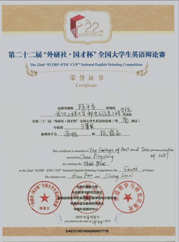 2019年4月12日至14日,第二十二届“外研社·国才杯”全国大学生英语辩论赛华南地区总决赛在汕头大学落下帷幕。我院公共学部英语教研室陈平香老师带队参加了此次比赛。经过两天六轮紧张激烈的角逐,公共学部英语专业16级高帆、程露茜同学荣获三等奖。 比赛前,我院两位选手积极查阅并收集相关文献资料,反复练习历年辩题,提升了协调合作能力和彼此间的默契度。 比赛中,每一轮结束,高帆和程露茜都会认真听取评委的点评,总结经验,在面对强劲对手时,两位同学沉着应对,为我院赢得了荣誉,也为我院英语辩论队的成长和发展积累了宝贵的经验。 本届“外研社·国才杯”全国大学生英语辩论赛由北京外国语大学、外语教学与研究出版社主办,教育部高等学校英语专业教学指导分委员会、中国外语与教育研究中心、中国外语测评中心合办。 “外研社·国才杯”全国大学生英语辩论赛始创于1997年,每年举办一届。历经22年的不懈努力和品牌积淀,已经发展成一项具有权威性、高规格、大规模的赛事活动。大赛的专业权威性已被全国高校、英语教师和在校大学生广泛认可,产生了深远的社会影响。 ![]() ![]() |
