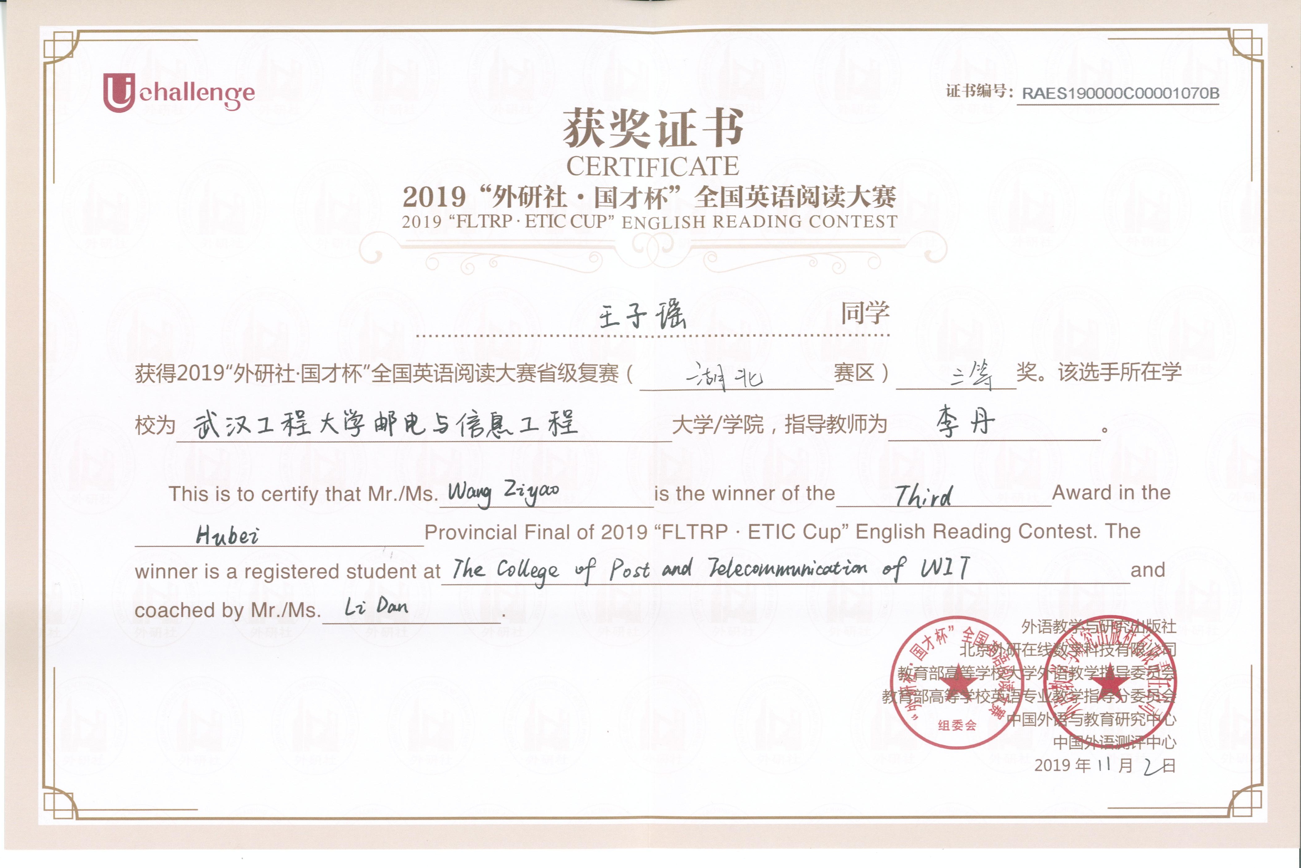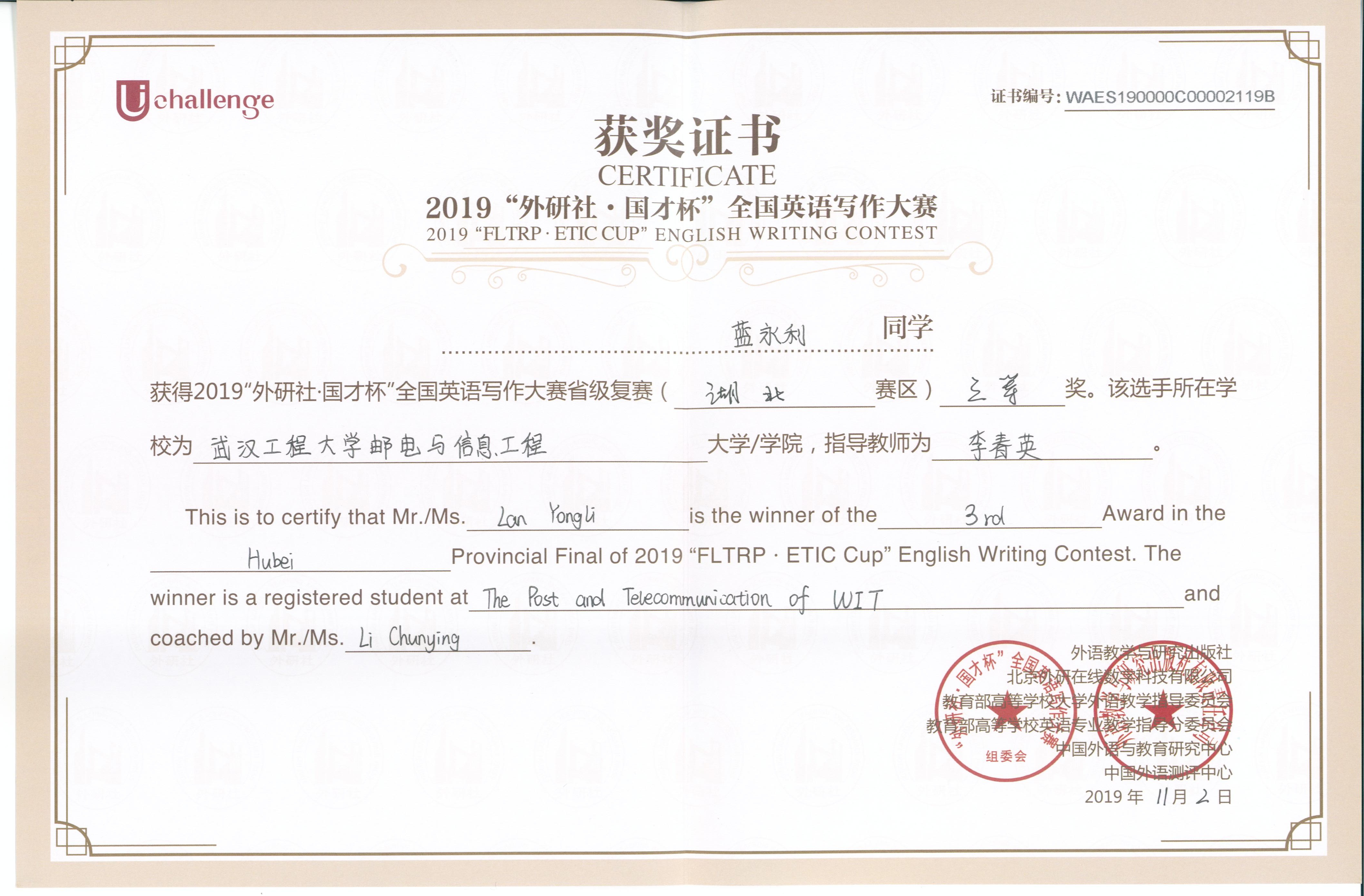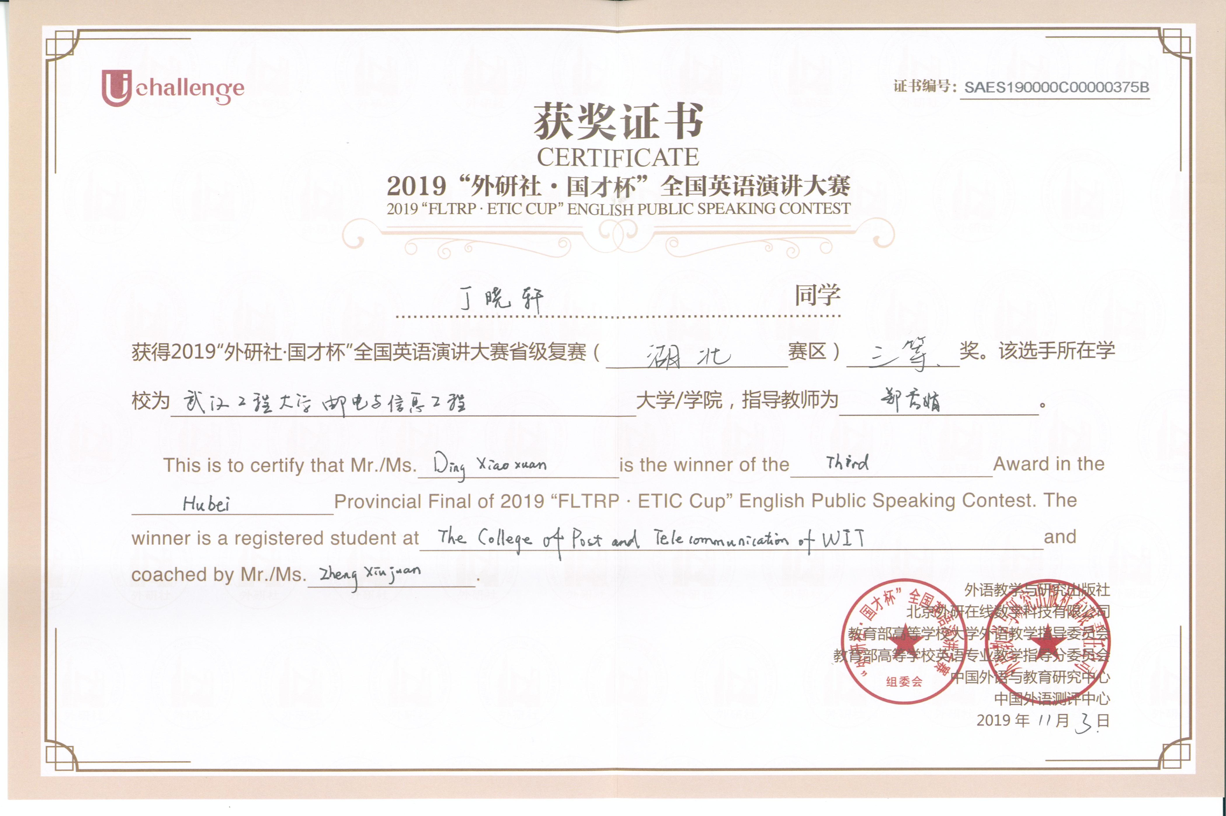 2019 年“外研社·国才杯”全国英语演讲、写作、阅读大赛湖北省复赛结果近日揭晓。我院公共学部丁晓轩、蓝永利、王子瑶三位同学分别荣获三等奖各一项,具体情况如下: