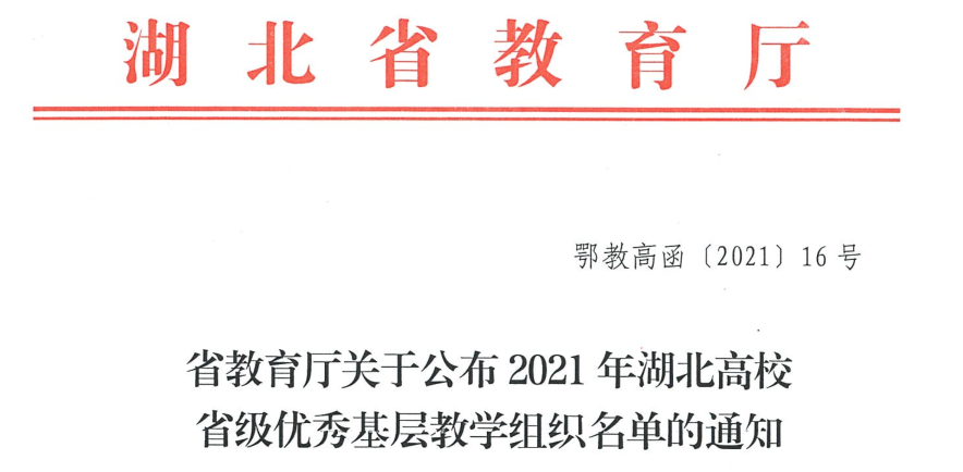 近日,湖北省教育厅下发《省教育厅关于公布2021年湖北高校省级优秀基层教学组织名单的通知》(鄂教高函〔2021〕16号),我院英语专业教研室获批2021年省级优秀基层教学组织。