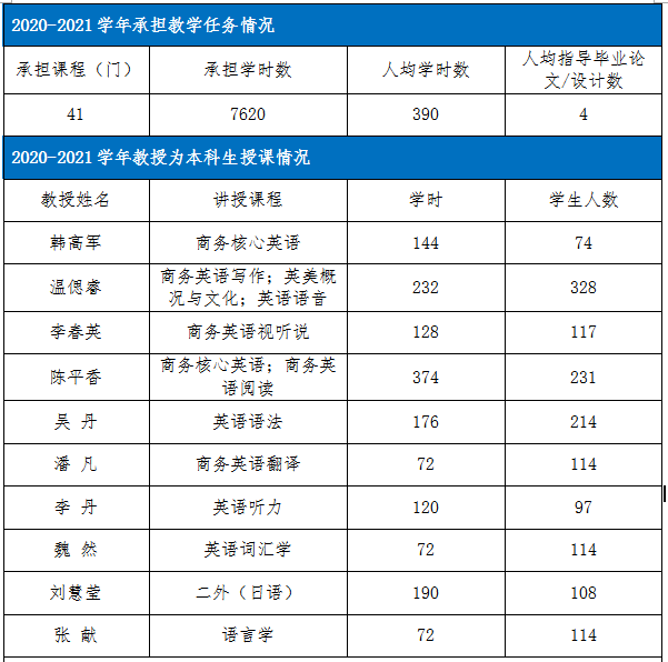 为保证教学质量,使学生充分享受优质的教育资源和师资,英语专业教研室全体教授副教授均承担英语专业本科生课程,主讲商务核心英语、商务英语写作、商务英语翻译、商务英语视听说、语言学、词汇学、英美概况与文化等共计12门,为本科生上课比率达到100%。2020-2021年度教研室全体教师承担了英语专业41门课程,总授课量达7620课时。 ![]() (一)主任书记“双带头”,强化师德师风建设 外语学院教工第一党支部设在英语专业教研室,教研室主任与支部书记为“双带头人”,全面领导教研室教学运行和师德师风建设。教研室充分结合每周教研活动和党组织生活,重在过程引导,不断加强对教师的师德师风的建设和引导,帮助教师树立正确的教师职业理想,提高教师的职业道德水平;严格落实师德师风第一标准、 进一步完善了师德师风考核办法,实行师德“一票否决制”。形成了一支忠诚于党的教育事业,热爱本职工作,让学生尊重、家长信赖、社会满意的教师队伍。 与此同时,英语教研室积极选拔教师参加党校培训,校级、省级师德师风演讲比赛,多人顺利毕业并取得优异的成绩。英语教研室所属教工党支部连续多年被评为校级“先进基层党组织”;2人获得湖北省高校教师党支部书记“双带头人”称号。近3年,1人获得师德师风演讲比赛一等奖、2人获得优秀共产党员称号、1人获得优秀党务工作者称号、1人获得校级“三八红旗手”称号。 (二)“走出去、请进来”,提升师资队伍素质 在保证教研室稳步发展的同时,有计划有组织地选派教师以外出学习、聆听讲座、参加线上线下培训、会议等形式相结合的方式,提高青年教师教学、科研、学术能力,加强自主学习与内功修炼的主动性。 为进一步营造浓厚的学术氛围,教研室不仅邀请校外专家来学院讲学,还坚持开展“外语讲坛”系列活动,由副教授以上职称教师担任分享嘉宾,围绕授课经验、竞赛指导、教科研项目申报与结项、教学成果凝练等内容在每周教研活动时开展。近3年,教研室有4位老师晋升为副教授。 ![]()