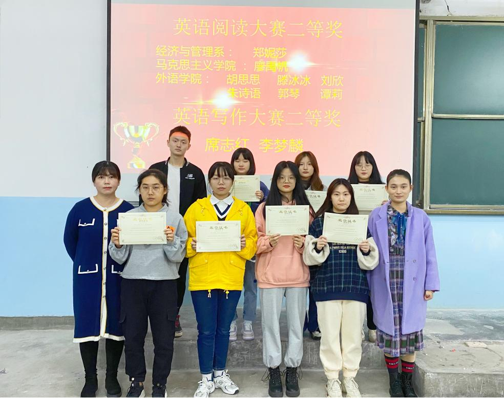 颁奖典礼中,参与颁奖的其他嘉宾还有:外语学院党总支副书记齐君老师,英语专业教研室主任陈平香老师,公共英语教研室主任吴丹老师,副主任桂文娟老师,外语学院英语教师胡慧老师和熊小燕老师。 ![]() 颁奖嘉宾与获奖选手合影留念 ![]() ![]() ![]() ![]() |