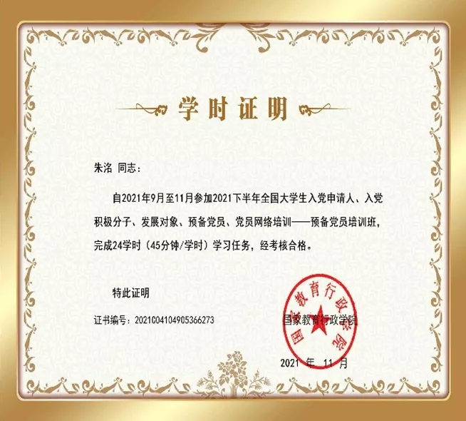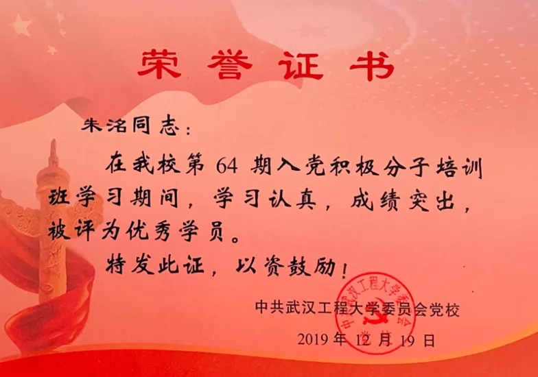 2018年10月向党组织递交了入党申请书,2019年10月参加第64期入党积极分子培训班学习,被评为“优秀学员”;积极参加党组织的各项活动,2020年12月顺利发展成为预备党员。